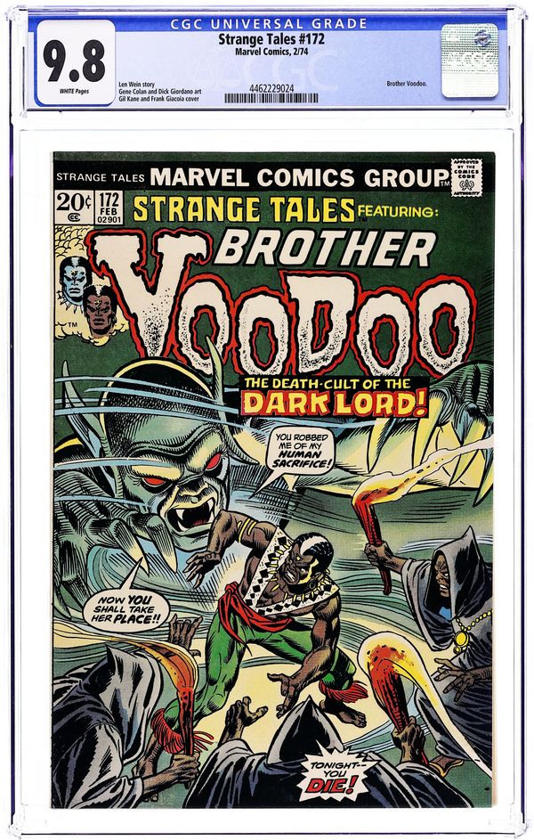 Cover pencils by Gil Kane, inks by Frank Giacoia. "Fiend in the Fog," script by Len Wein, pencils by Gene Colan, inks by Dick Giordano; Outside his home in New Orleans, Brother Voodoo spots a young girl being swept away in the Mississippi River; Diving into the water, Voodoo manages to save the girl and bring her back to his home; There he learns that she is Loralee Tate, daughter of Samuel Tate the local chief of police; She tells Brother Voodoo that she has been stalked by a group called the Cult of the Darklord. The reprint of an old weird story, "Voodoo," script by Carl Wessler, art by Gene Colan. 36 pgs., full color. Cover price $0.20. Grade: CGC 9.8 explanation of grade Condition: Used (collectible)