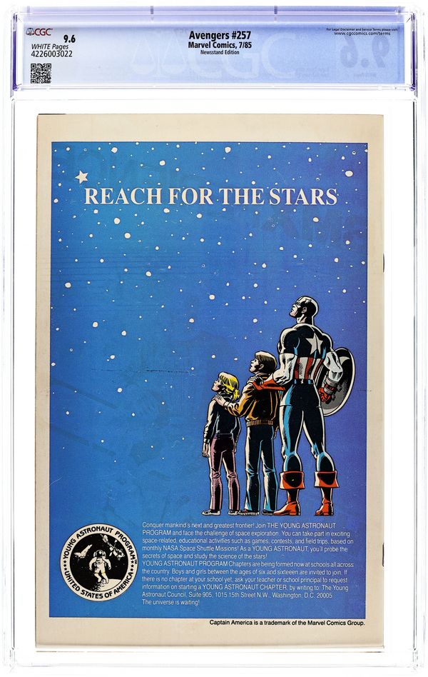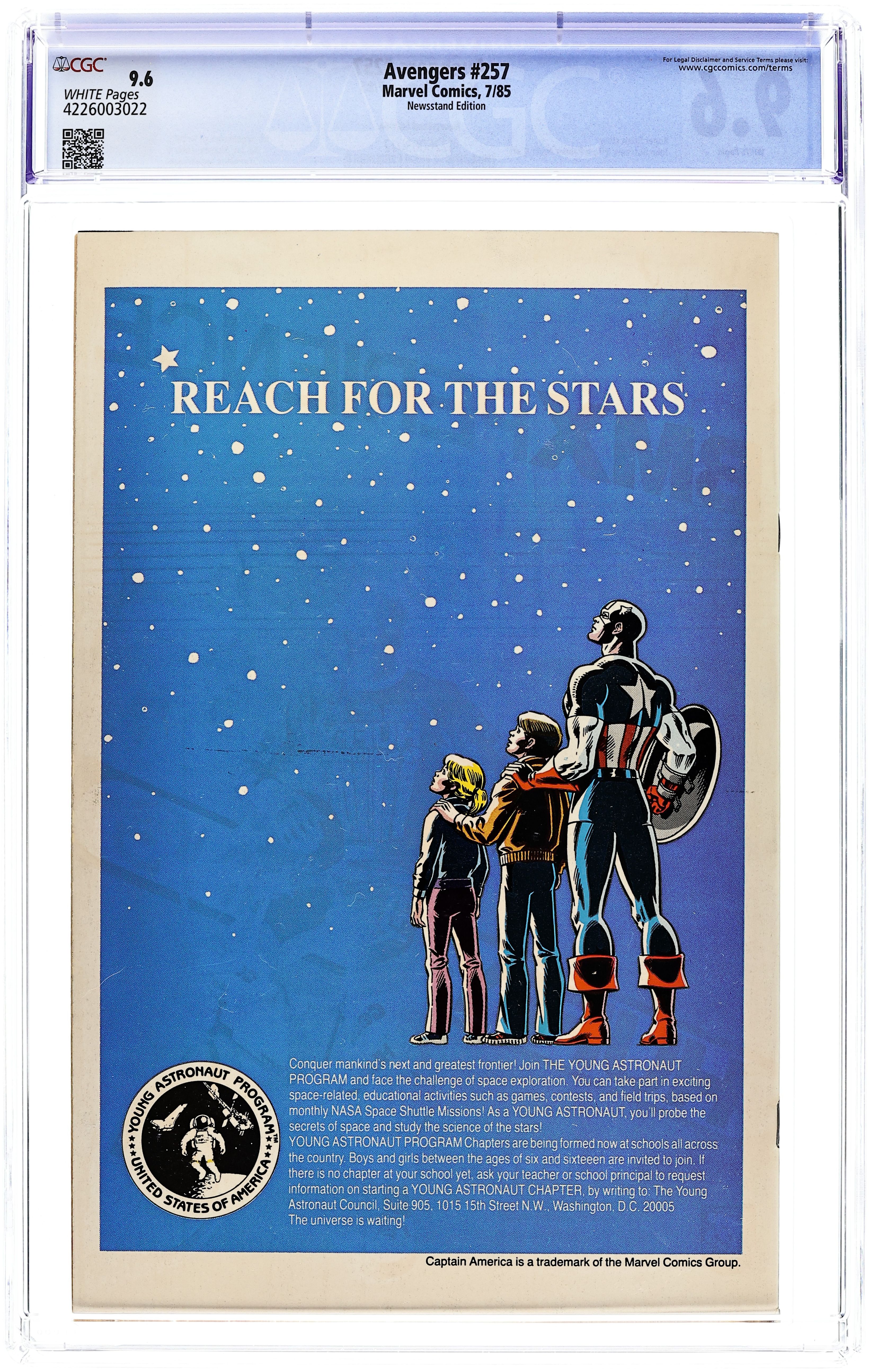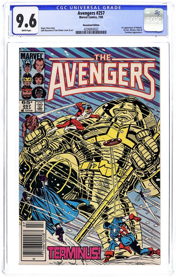 Newsstand Edition. "Holocaust in a Hidden Land!" Part 2 of 2. Guest-starring Ka-Zar and Shanna. Script by Roger Stern. Art by John Buscema (breakdowns) and Tom Palmer (finishes). Cover by John Buscema and Tom Palmer. Terminus is on a rampage through the Savage Land! And only Earth's Mightiest Heroes stand between the powerful alien and the utter destruction of the bottom of the world! Will the combined might of the Black Knight, shield-slinger, Starfox, Wasp, and Prince of Power be enough to prevent the annihilation of the hidden paradise? Or will Antarctica, centuries later, finally reclaim the Savage Land? A cold and bitter ending for Ka-Zar and the Avengers! Meanwhile light years away in outer space, Captain Marvel meets a new super-villain that will battle the Avengers for years to come! First appearance of Nebula. (Notes: The Savage Land first appeared in Uncanny X-Men (1st series) 10. The High Evolutionary attempts to restore the Savage Land in Uncanny X-Men Annual 12. This issue includes a full-page ad for the Secret Wars II Limited Series.) 36 pages Cover price $0.65. Grade: CGC 9.6 explanation of grade Condition: Used (collectible)