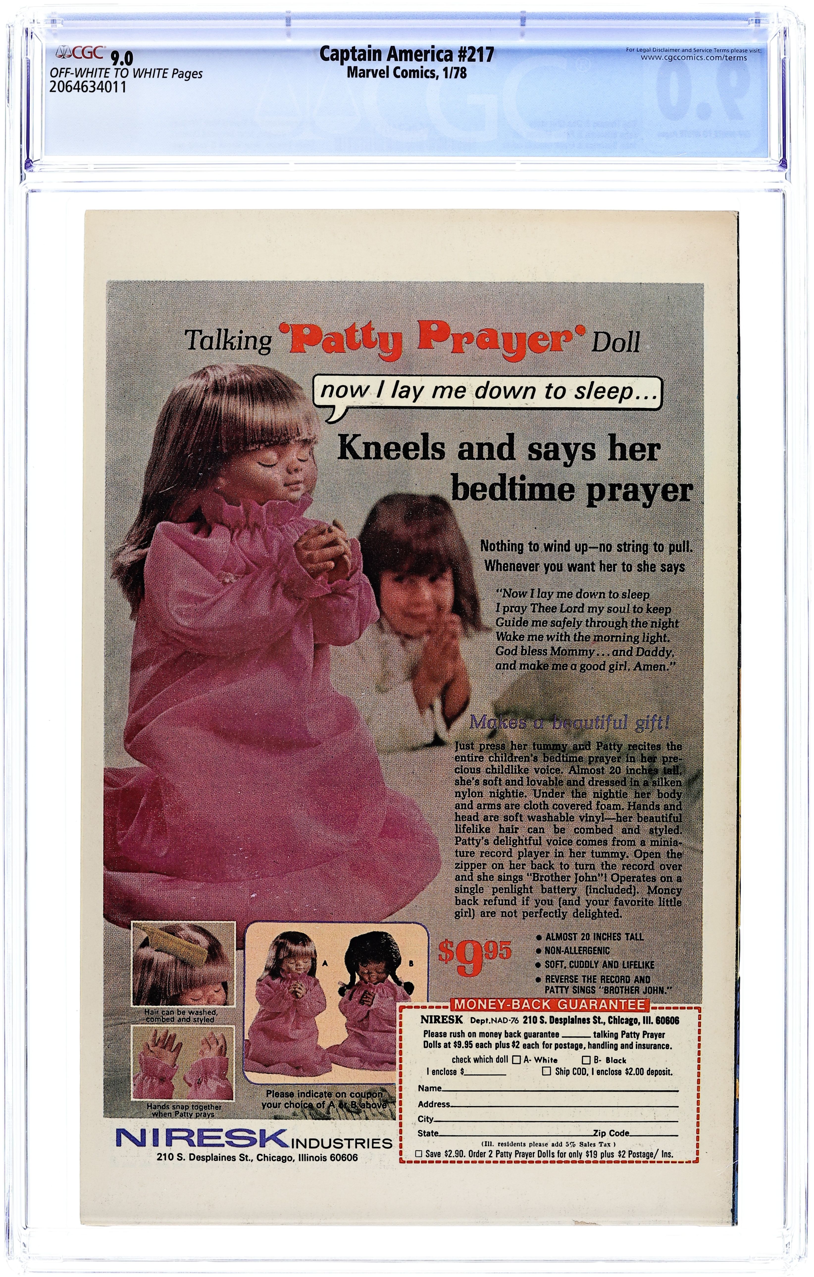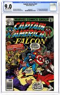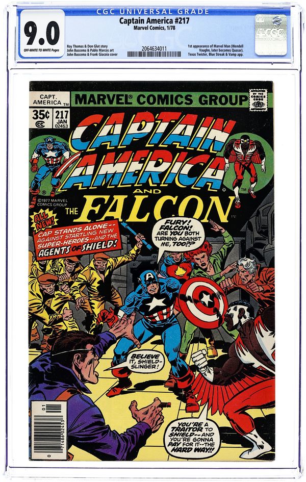 First appearance of Quasar (aka Marvel Man) in "The Search for Steve Rogers!" Plot by Roy Thomas. Script by Don Glut. Pencils by John Buscema. Inks by Pablo Marcos. Cover by John Buscema and Frank Giacoia. Captain America and the Falcon visit SHIELD's underground complex in Midtown...and meet the new Super-Agents of SHIELD! Nick Fury has been concerned about a shadowy organization called: The Corporation, so he recently assembled his own team of super-powered operatives. They are: the Blue Streak, Marvel Boy (aka Wendell Vaughn), the Texas Twister, and the Vamp. And now the Director of SHIELD wants the Sentinel of Liberty to put the new Super-Agents to the test! Four against one! This should be a piece of cake for the star-spangled avenger! First appearances of the Blue Streak and the Vamp. Cameo appearances by Dum Dum Dugan, Sharon Carter, Senator Kligger Stivak, Veda, and Redwing. (Notes: Wendell Vaughn was only called Marvel Boy in issue 217. Redwing appears for the first time since Captain America 191.) 36 pages. Cover price $0.35. Grade: CGC 9.0 explanation of grade Condition: Used (collectible)