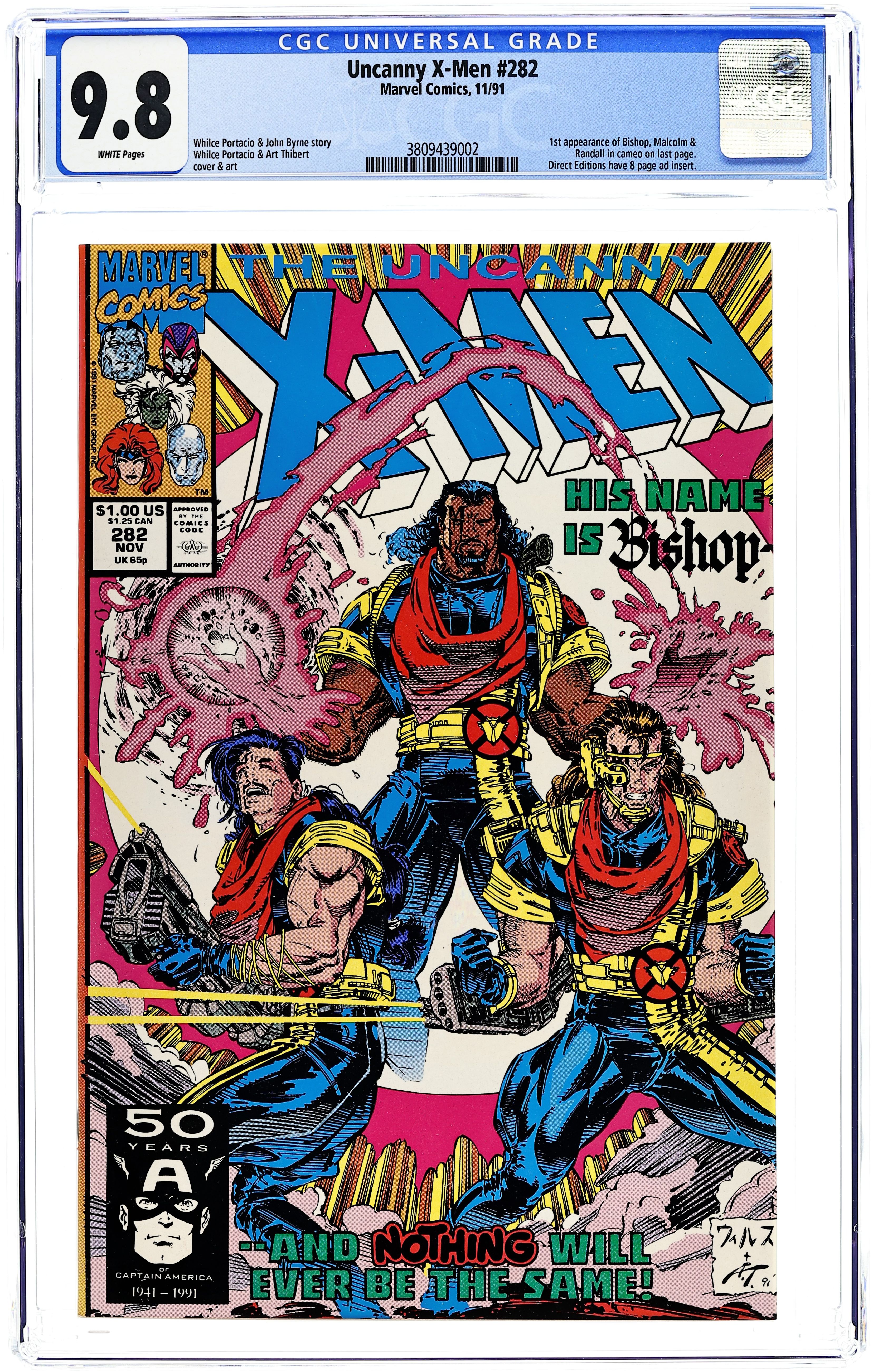 Direct Edition. "Payback!" Story by Whilce Portacio and John Byrne. Art by Whilce Portacio and Art Thibert. In one fell swoop the Upstarts have destroyed the Reavers and crippled the Hellfire Club. Next up, the Mutant Liberation Front. Who can stop these powerful new foes? Enter: Bishop! NOTE: 1st appearance of Bishop. 40 pgs. Cover price $1.00. Grade: CGC 9.8 explanation of grade Condition: Used (collectible)