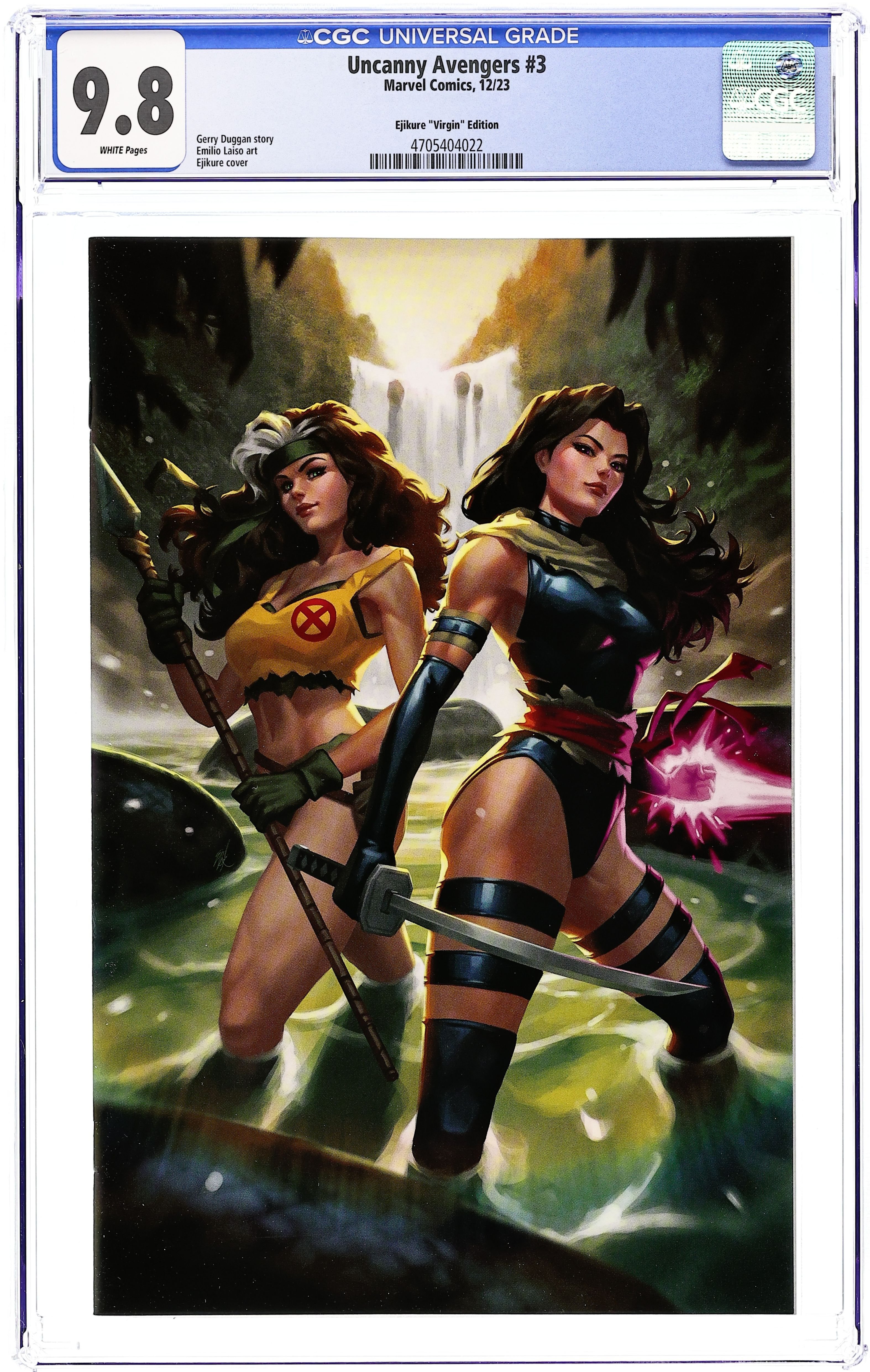 Starts May 4 Comics Illuminati (Unknown Comics, Comic Traders, Anti-Hero Gallery, and The 616 Comics) Exclusive Virgin Cover by Ejikure. Written by Gerry Duggan. Art by Emilio Laiso. The Unity Squad faces off against the Mutant Liberation Front. Blood will be spilled, and one will fall - TO THEIR DEATH! Plus, Captain America's been hit with grenades, bullets and bombs, but somebody lobs something at Captain America that we've never seen before. 'Nuff said! 28 pages, full color. Rated T+ Grade: CGC 9.8 explanation of grade Condition: Used (collectible)