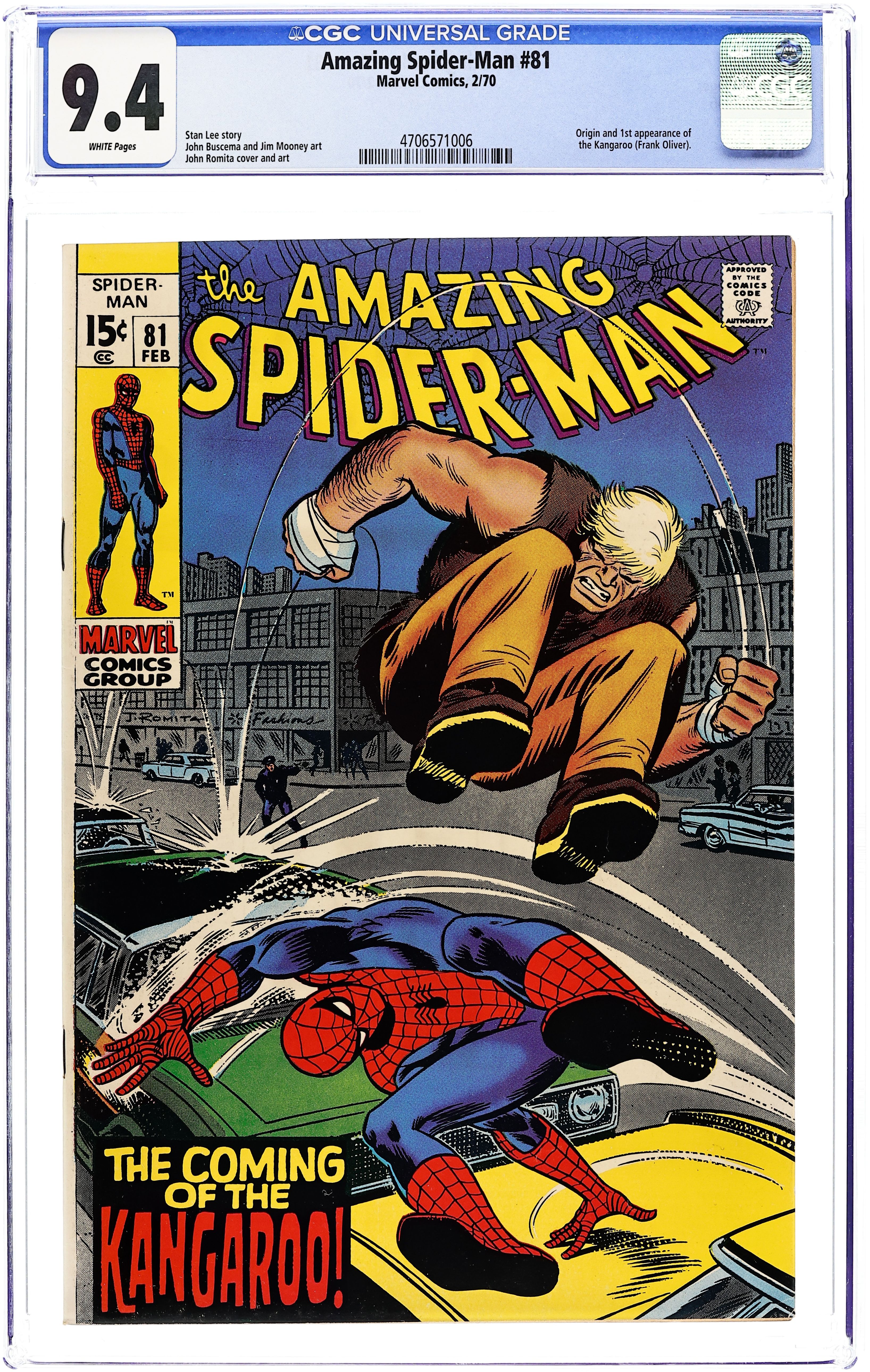 First appearance of the Kangaroo in "The Coming of the Kangaroo!" Plot by John Romita. Script by Stan Lee. Art by John Buscema (layouts) and Jim Mooney (finishes). Cover by John Romita. The wondrous wall-crawler rushes to Penn Station to meet Aunt May -- who is returning to New York after her vacation in Florida. Following a quick change of clothes, Peter greets his aunt on the platform...and then observes a disturbance nearby! A large man from Australia leaps away from two federal marshals...and escapes into thestreets! Peter can't pursue him right now, but he will tangle with the Kangaroo very soon! The super-villain from down under is looking for money, but he accidentally steals a vial of deadly bacteria instead. So when the web-slinger catches the Kangaroo, he must be very careful with hisAustralian adversary! Good luck mate! Origin of the Kangaroo. Cameo appearance by J. Jonah Jameson. (Notes: The Kangaroo returns in Amazing Spider-Man 126. This story was reprinted in Marvel Tales #62.) 36 pages. Cover price $0.15. Grade: CGC 9.4 explanation of grade Condition: Used (collectible)