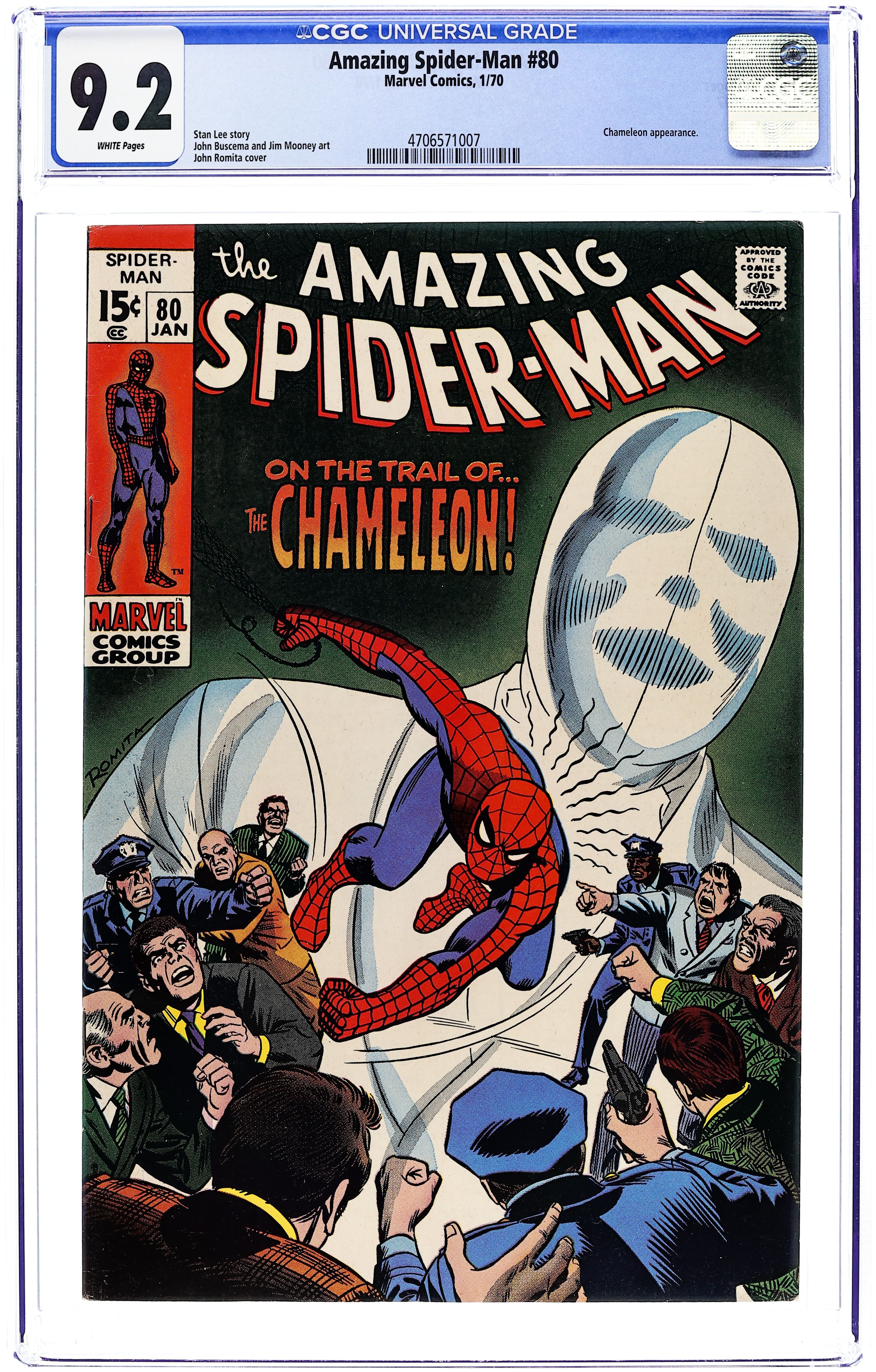 "On the Trail of the Chameleon!" Script by Stan Lee. Art by John Buscema (layouts) and Jim Mooney (finishes). Cover by John Romita. Peter Parker and Gwen Stacy meet for a date at the Midtown Museum to see its new exhibit of priceless paintings. And also at the museum is Gwen's father...who is in charge of security for the evening. So when the paintings are shockingly stolen, Captain Stacy gets blamed for the theft! Peter knows the trusted police captain would never do that. So who did? Ultimately, the web-slinger remembers the name of the Chameleon...and sets a trap for the master of disguise! However the Chameleon is crafty, and he eludes Spider-Man's trap -- until the faceless villain makes a very big mistake! Cameo appearances by Flash Thompson, Harry Osborn, J. Jonah Jameson, and Joe Robertson. (Notes: The wall-crawler previously encountered the Chameleon in Amazing Spider-Man (1st series) #15. This story was reprinted in Marvel Tales #61.) 36 pages. Cover price $0.15. Grade: CGC 9.2 explanation of grade Condition: Used (collectible)