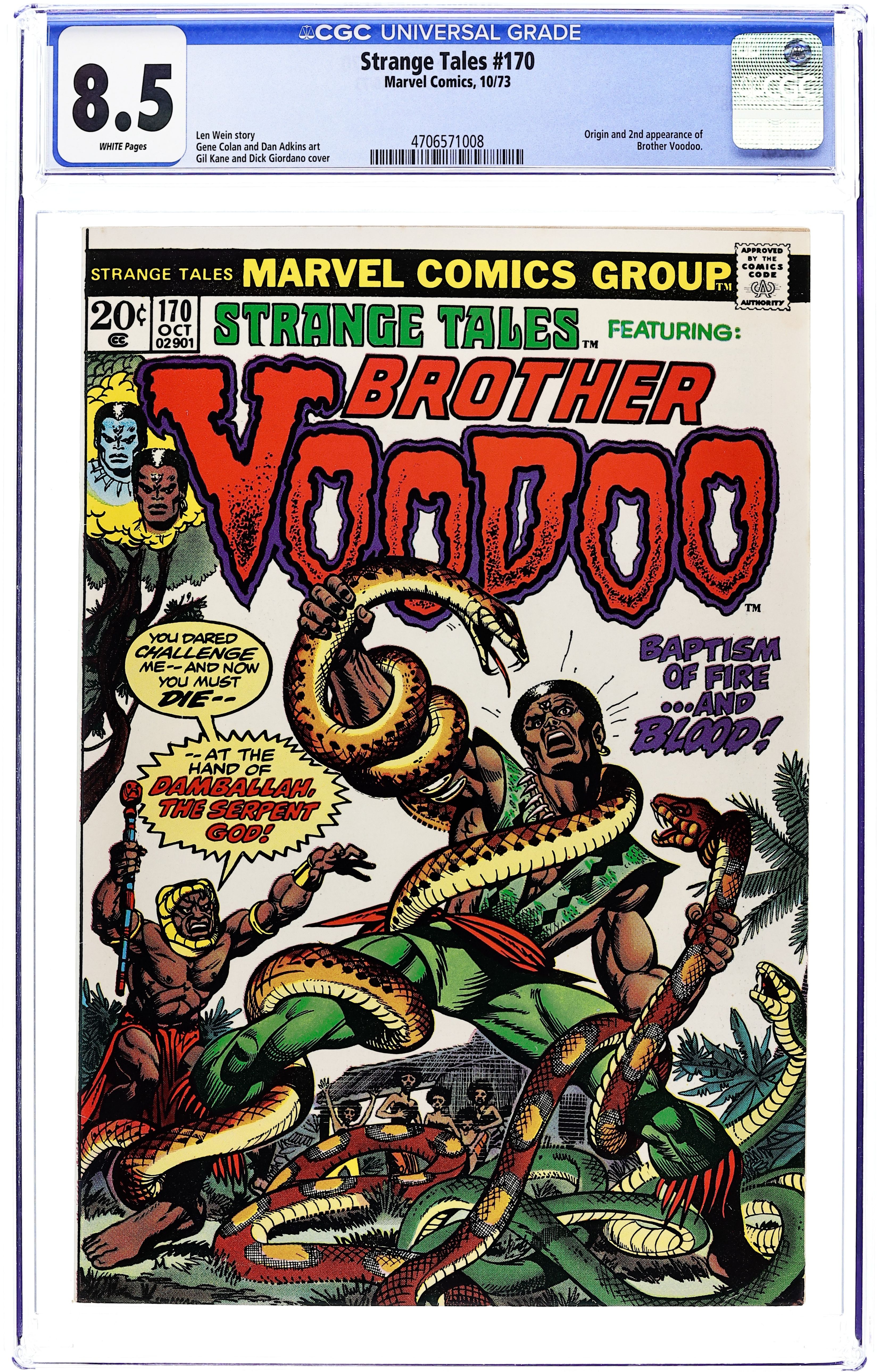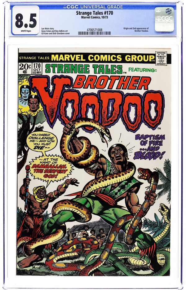 Cover pencils by Gil Kane. "Baptism of Fire!", script by Len Wein, pencils by Gene Colan, inks by Dan Adkins; Papa Jambo trains Jericho Drumm to be Brother VooDoo; Brother VooDoo then returns and stops Damballah, the Serpent God. 36 pgs., full color. Cover price $0.20. Grade: CGC 8.5 explanation of grade Condition: Used (collectible)