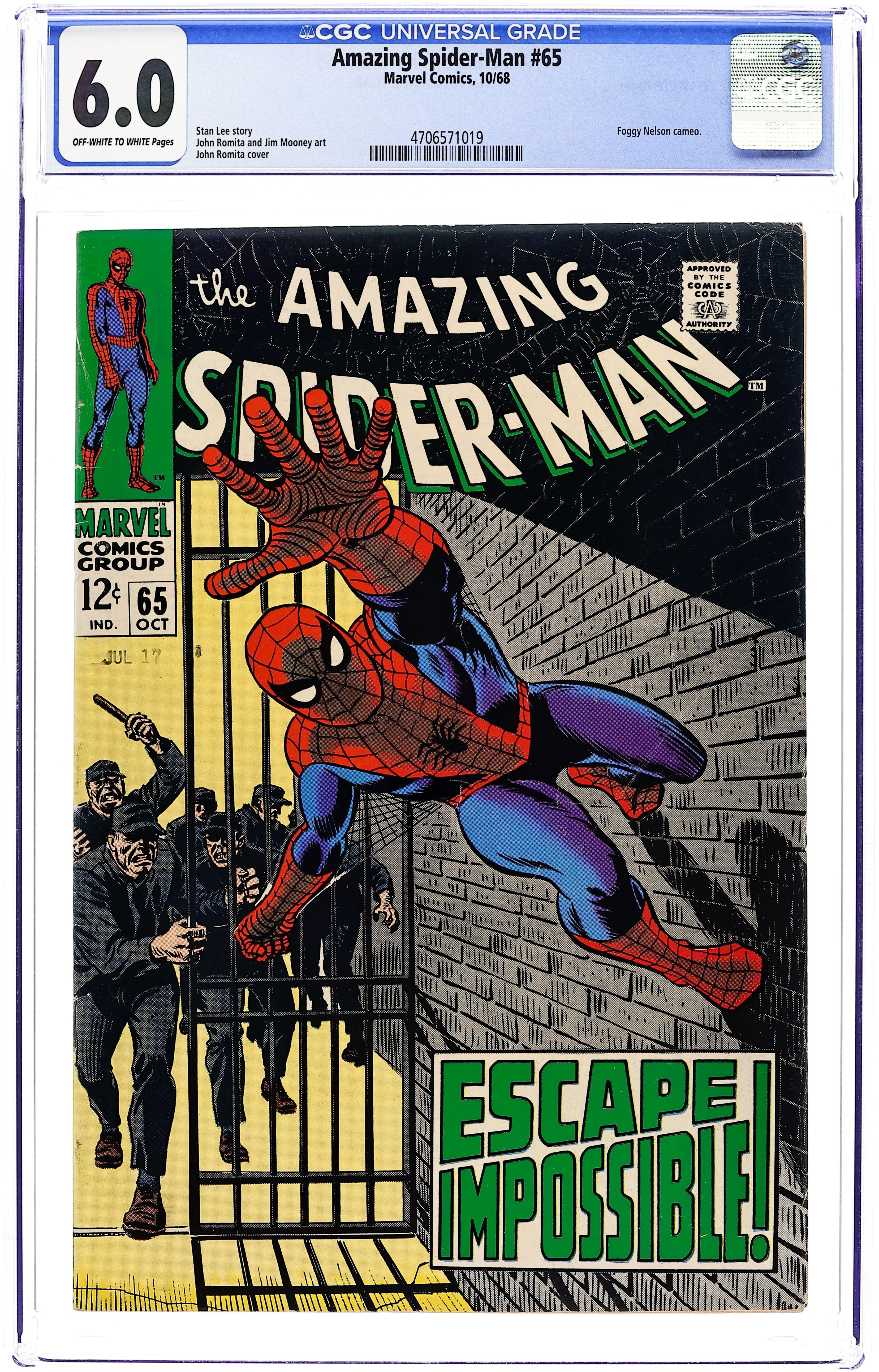 "The Impossible Escape!" Script by Stan Lee. Art by John Romita (layouts) and Jim Mooney (finishes). Cover by John Romita. The wondrous wall-crawler lies unconscious in the street after defeating the Vulture. Thankfully, Captain George Stacy is at scene, and he prevents the crowd from unmasking the web-slinger! However Spider-Man is still taken to a nearby prison -- and placed in the infirmary to recover. In the meantime, six dangerous inmates are preparing to break out of prison. And their plan calls for escaping through the infirmary! Did the sextet pick the wrong day for a jailbreak? Spider-Man says yes! Cameo appearances by Foggy Nelson, Joe Robertson, J. Jonah Jameson, Aunt May, Gwen Stacy, Harry Osborn, and Mary Jane Watson. (Note: This story was reprinted in Marvel Tales #48.) 36 pages. Cover price $0.12. Grade: CGC 6.0 explanation of grade Condition: Used (collectible)