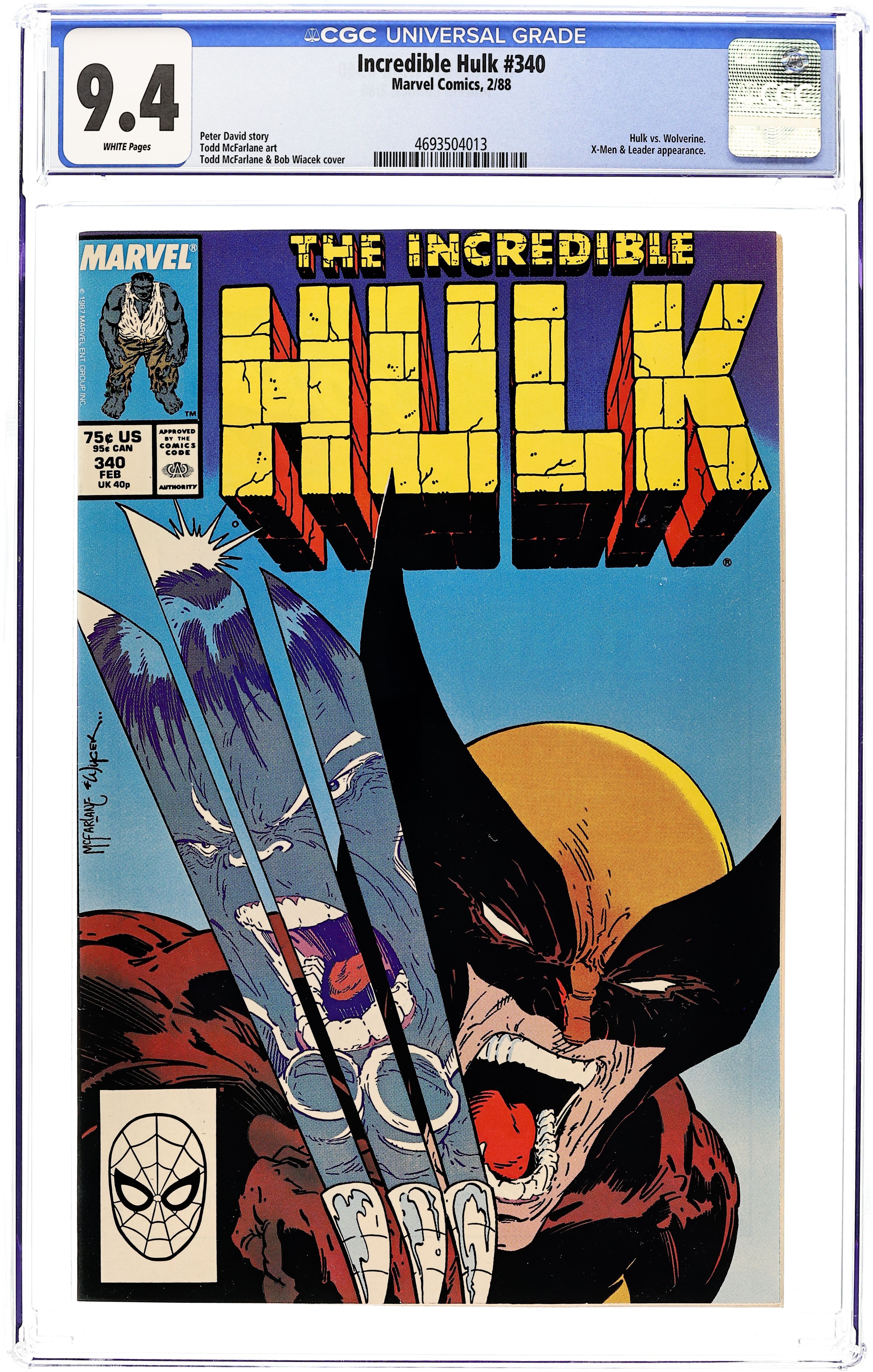 Direct Edition. Fall of the Mutants crossover. "Vicious Circle!" Guest-starring Wolverine. Uncanny X-Men cameo. Story by Peter David. Art by Todd McFarlane. The Canadian mutant and the Incredible Hulk have never had a friendly relationship. This is their second and arguably most vicious battle to date. As the X-Men make their way to their ultimate fate at Forge's tower in Dallas (also see Uncanny X-Men #225-227), Wolverine separates from the group to confront a familiar scent. Before the Canuckle-Head can explain that he's not here for a fight, the Hulk, who hasn't forgotten their last meeting, attacks. 36 pgs. Cover price $0.75. Grade: CGC 9.4 explanation of grade Condition: Used (collectible)