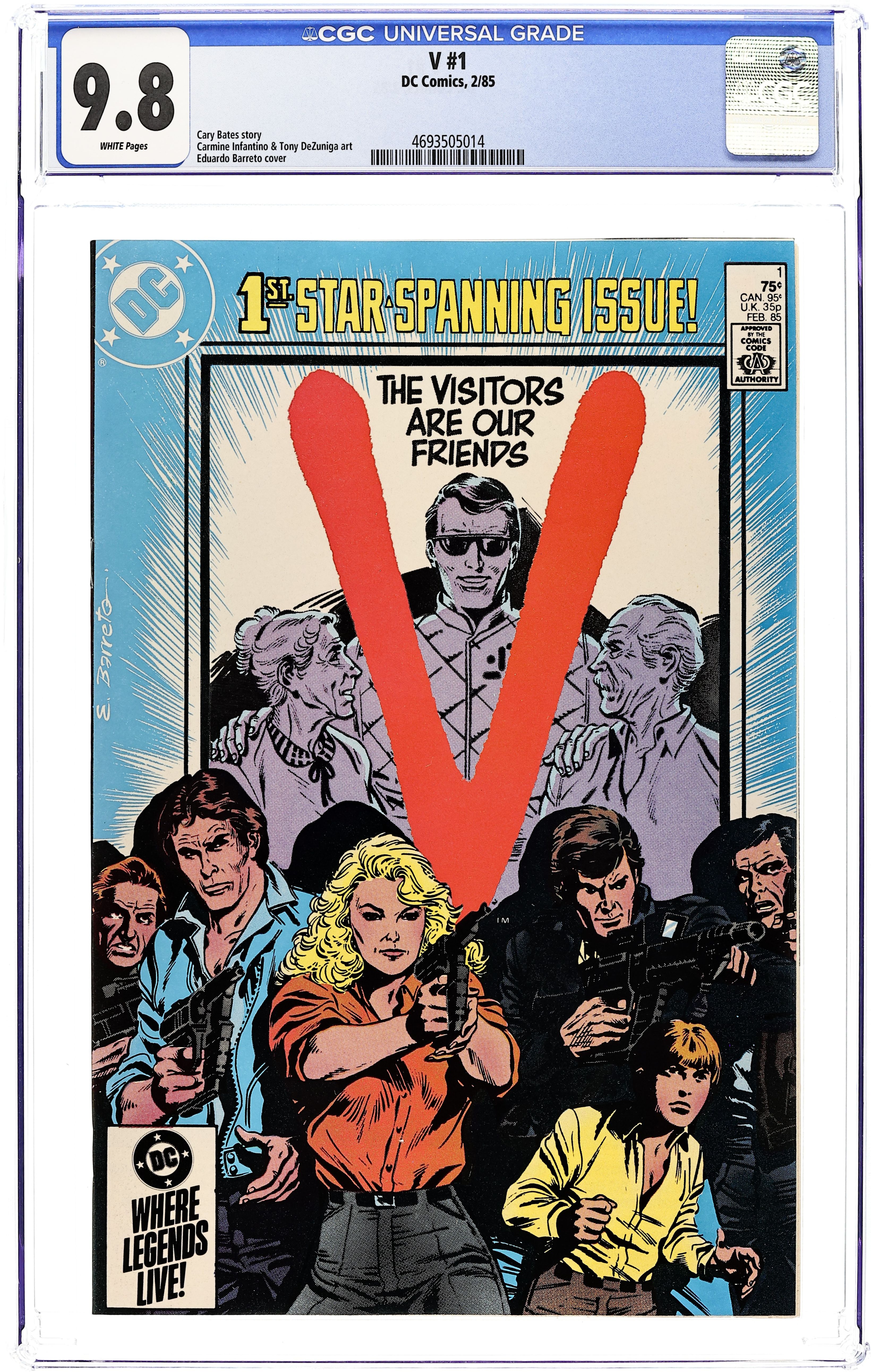 Direct Edition. "City on the Edge!" Written by Cary Bates. Art by Carmine Infantino and by Tony DeZuñiga. Cover by Eduardo Barreto. Based on the cult hit TV miniseries! In Los Angeles, a small band of resistance fighters fight the good fight in an effort to bring down the visiting, cold-blooded aliens. Includes a 1-page text piece by editor Marv Wolfman. 32 pages, FC. Cover price $0.75. Grade: CGC 9.8 explanation of grade Condition: Used (collectible)