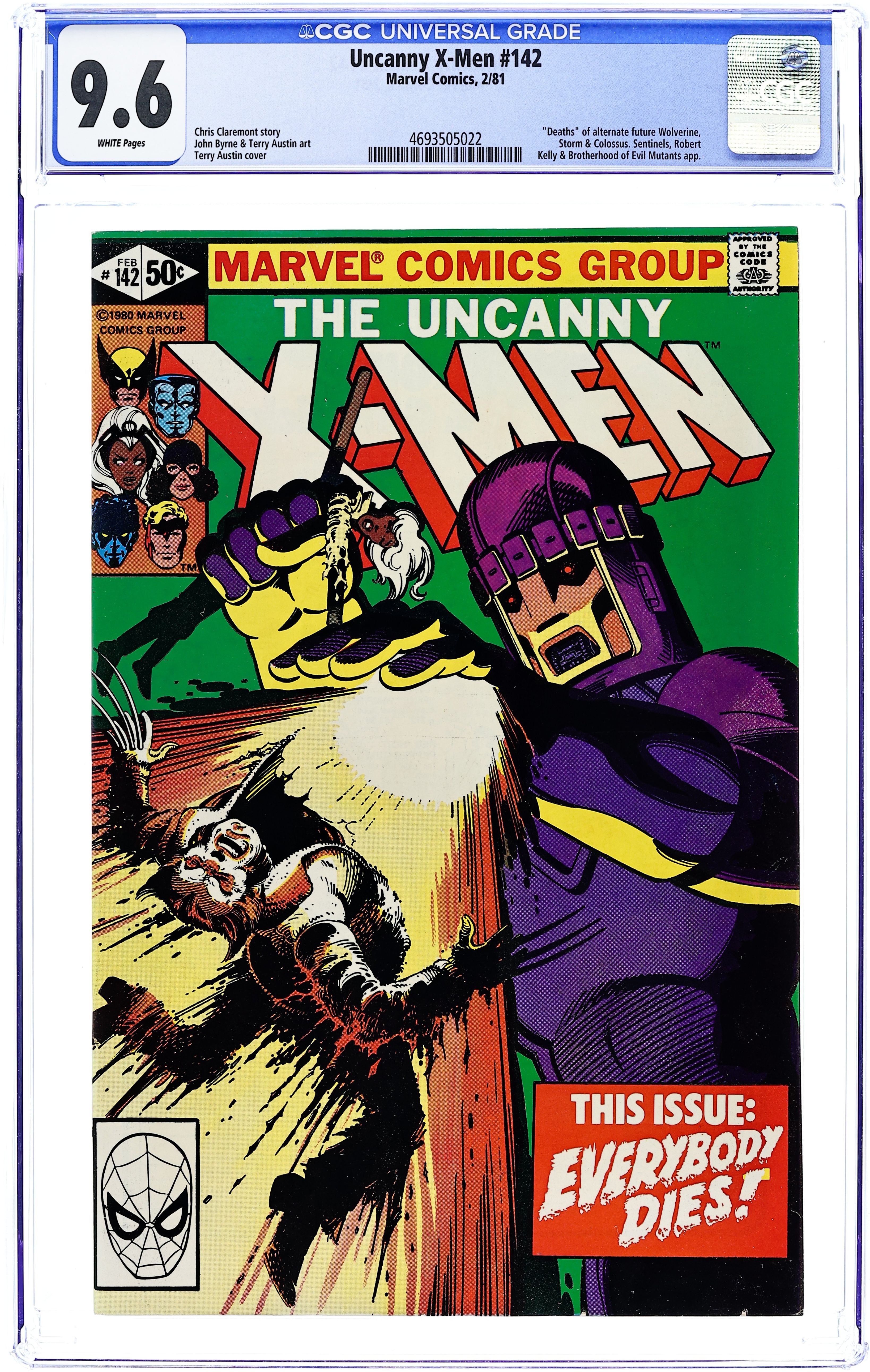 Direct Edition. Days of Future Past: Part 2 of 2. "Mind Out of Time!" Story by Chris Claremont and John Byrne. Art by John Byrne and Terry Austin. Cover by Terry Austin. In order to prevent a dystopian future where all mutants and super-heroes are hunted and killed by the robotic Sentinels, the X-Men must prevent the new Brotherhood of Evil Mutants from assassinating Senator Kelly. Featuring one of the most shocking death scenes in the comic book history. NOTE: Uncanny X-Men #123 and #142 are rare commodities in the realm of comics as they are two of the very few covers where inker extraordinaire Terry Austin actually does the pencils as well. - Odinson Lone Star Comics Archivist. 36 pgs. Cover price $0.50. Grade: CGC 9.6 explanation of grade Condition: Used (collectible)