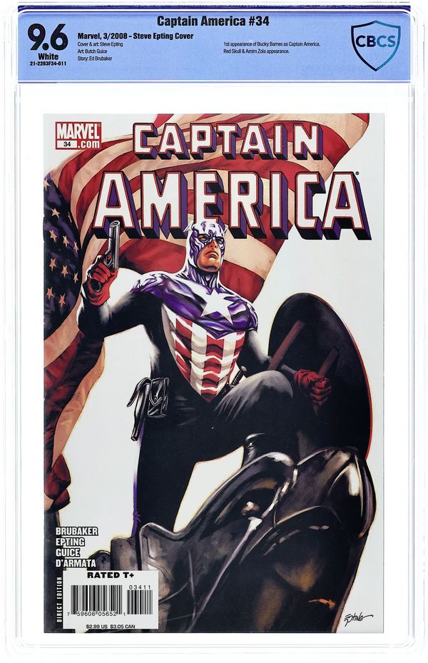 Starts May 11 Cover by Steve Epting. The Death of Captain America Act 2: Part 4 of 6 - Written by ED BRUBAKER Pencils by STEVE EPTING. Is this the NEW Captain America?! Cover price $2.99. Grade: CBCS 9.6 explanation of grade Condition: Used (collectible)