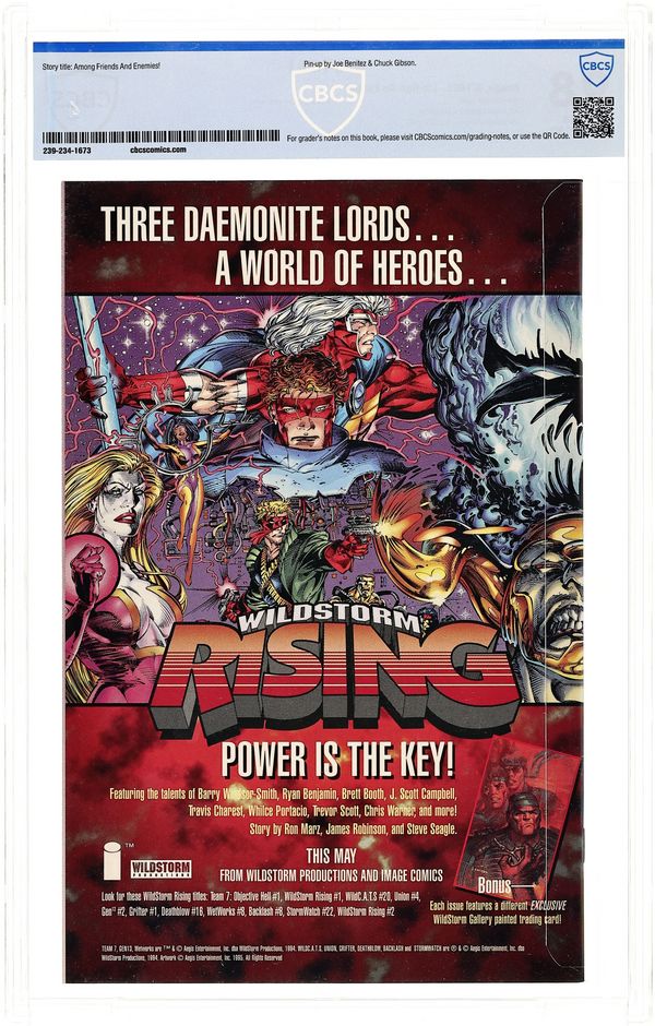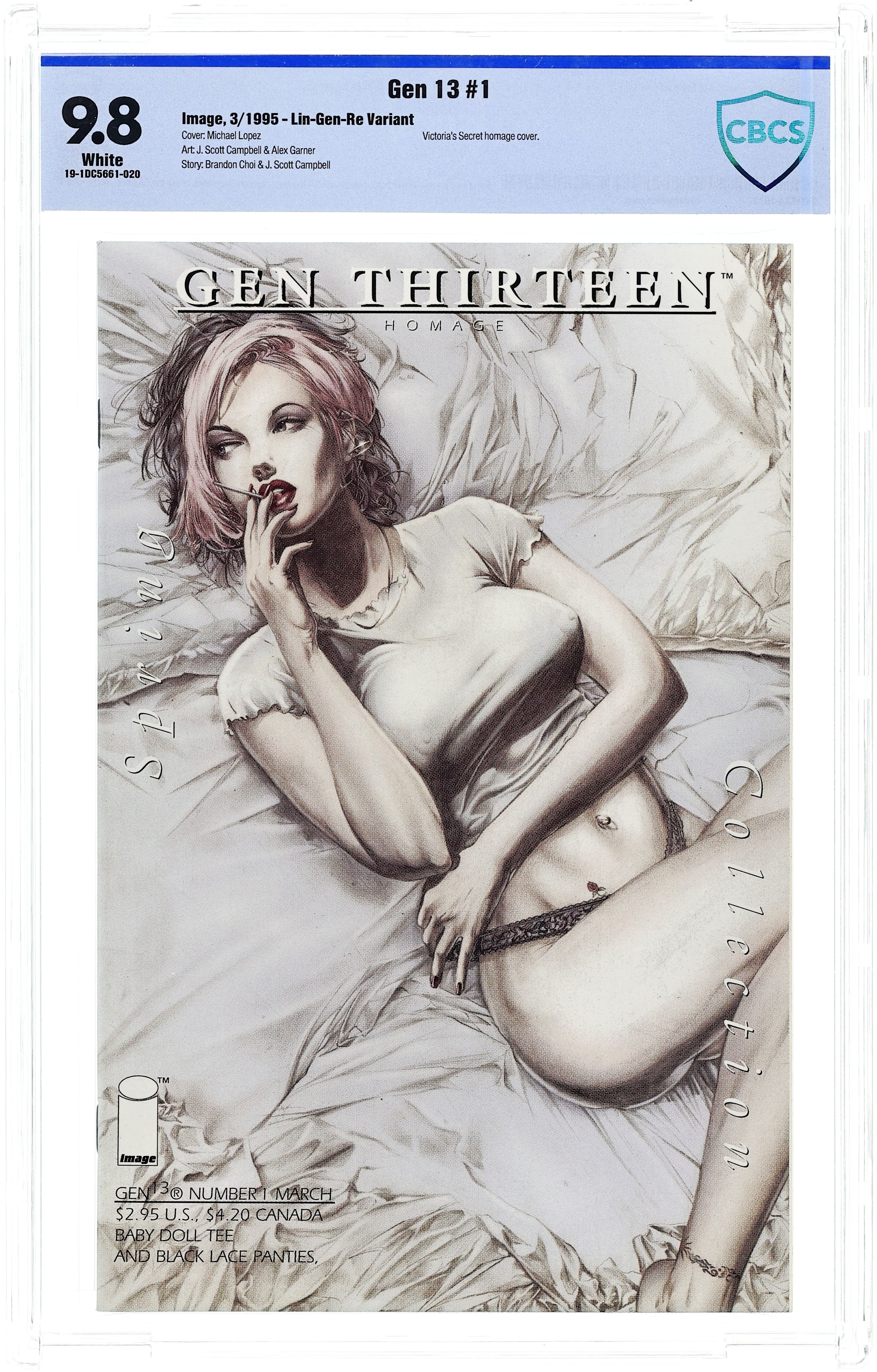 Lin-Gen-Re cover by Michael Lopez. NOTE: 1st appearance of Gen 13 was in Wildcats Trilogy #1. Cover price $2.95. Grade: CBCS 9.8 explanation of grade Condition: Used (collectible)