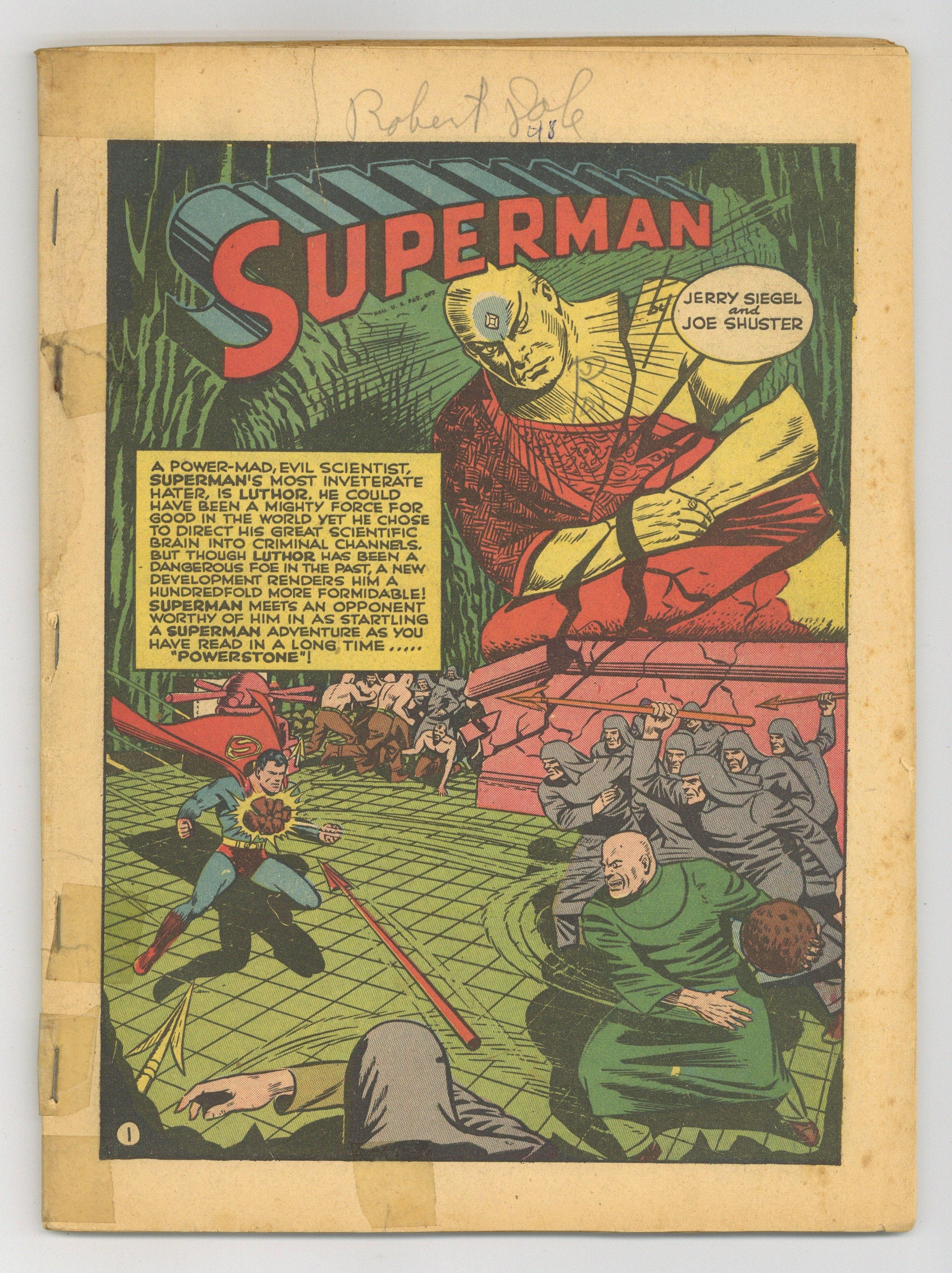 1st Lex Luthor cover in comics - Cover art by Fred Ray. Powerstone starring Superman, script by Jerry Siegel, art by John Sikela; story continued in part in Superman #17. Vigilante story, script by Mort Weisinger, pencils by Mort Meskin. Three Aces story, script by Gardner F. Fox, art by Louis Cazeneuve. The Skeletons in Armor starring Mr. America, script by Ken Fitch, art by Bernard Baily. Congo Bill story, art by Fred Ray. Zatara story, script by Gardner F. Fox, art by Joseph Sulman. 68 Pages, Full Color. $.10 Cover price $0.10. Grade: Coverless explanation of grade Condition: Used (collectible)