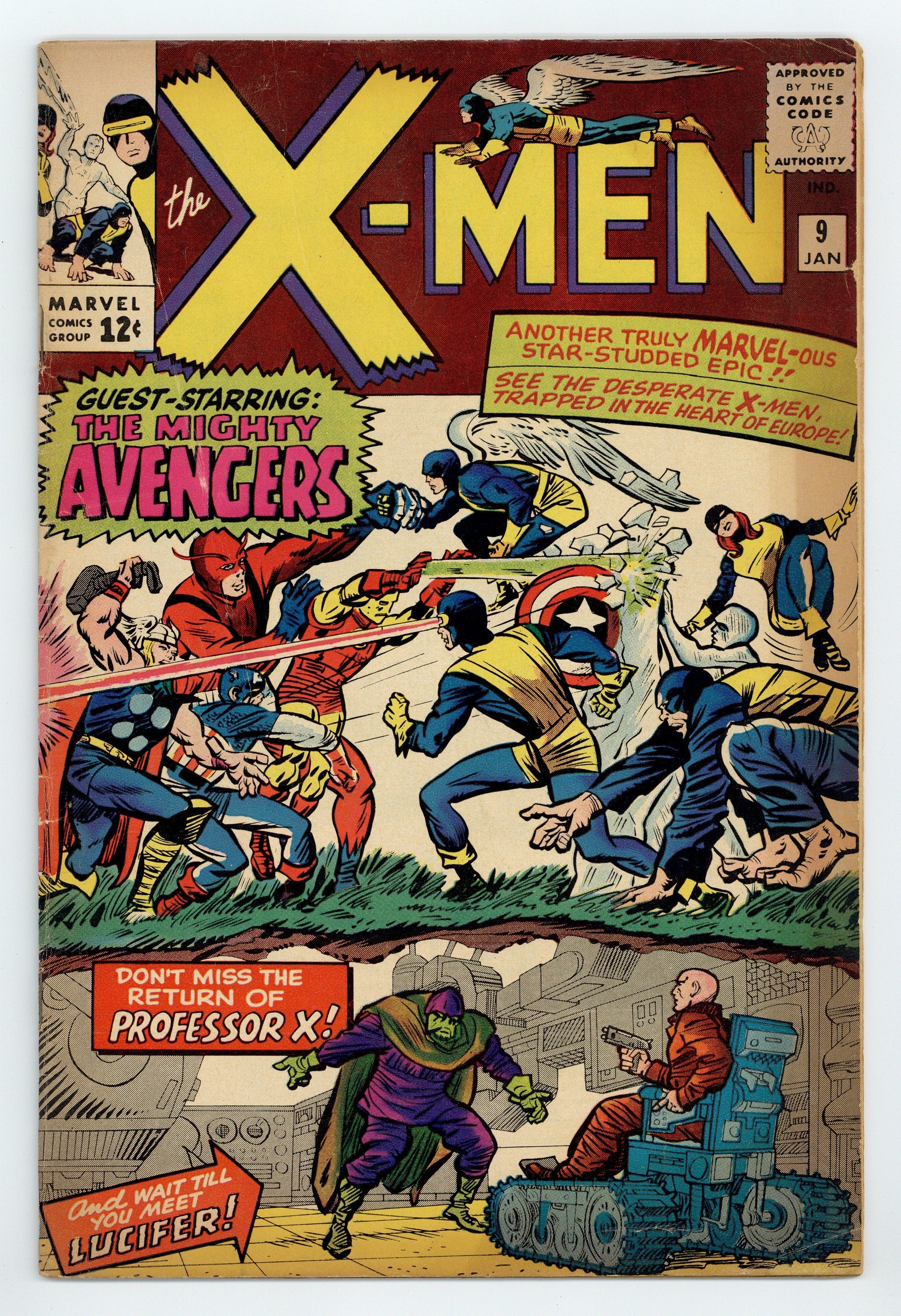 Starts Apr 4 "Enter, The Avengers!" Script by Stan Lee, pencils and cover by Jack Kirby with inks by Chic Stone. 1st meeting of X-Men and the Avengers, 1st appearance of Lucifer. Also features a Marvel Girl "Marvel Masterwork" pin-up with pencils by Kirby and inks by Chic Stone. 36 pgs. Cover price $0.12. Grade: GD/VG 3.0 explanation of grade Condition: Used (collectible)