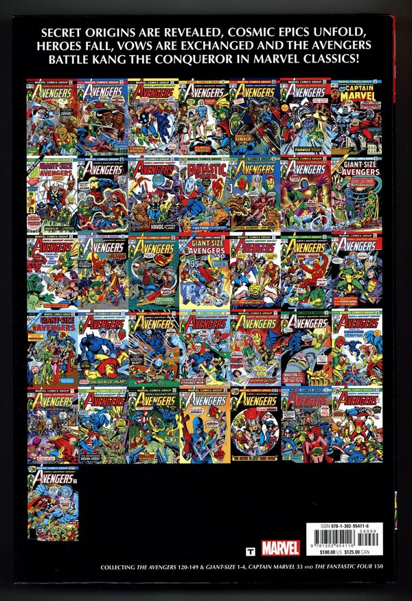 Volume 5 - 1st printing. Collects The Avengers (1963-1996 1st Series) #120-149, Giant Size Avengers (1974) #1-4, Captain Marvel (1968-1979 1st Series Marvel) #33, FFantastic Four (1961-1996 1st Series) #150 and material from FOOM (1973-1978 Marvel) #6-7 and 12. Written by Steve Englehart, Tony Isabella, Scott Edelman, Roy Thomas, and Gerry Conway. Art by Bob Brown, John Buscema, Sal Buscema, George Tuska, Tom Sutton, Don Heck, Keith Pollard, Rich Buckler, Jim Starlin, Rich Buckler, Don Heck, Mike Esposito, Dave Cockrum, Joe Staton, Frank Chiaramonte, Mike Ploog, Vince Colletta, Sam Grainger, John Tartaglione, Dan Adkins, Joe Giella, Klaus Janson, Joe Sinnott, and George Perez. Cover by Gil Kane. Prepare to assemble for another epic Avengers Omnibus edition, brought to you this time by Steve Englehart and a host of Marvel's greatest artists! They present Earth's Mightiest Heroes in some of their most iconic adventures: the origin of Mantis, the Avengers' first conflict with Thanos and a defining Kang the Conqueror saga that spans space and time. Of course, there's plenty of personal drama opposite the action as Quicksilver and the Scarlet Witch's origins are explored and two weddings bring together Marvel's heroes. New members will also join the ranks as the Beast, Hellcat and Moondragon become Avengers. This volume also features the series' letters pages as well as art and interviews from Marvel's famous fanzine F.O.O.M.! Hardcover, 856 pages, full color. Rated T Cover price $100.00. Grade: NM 9.4 explanation of grade Condition: Used (collectible)
