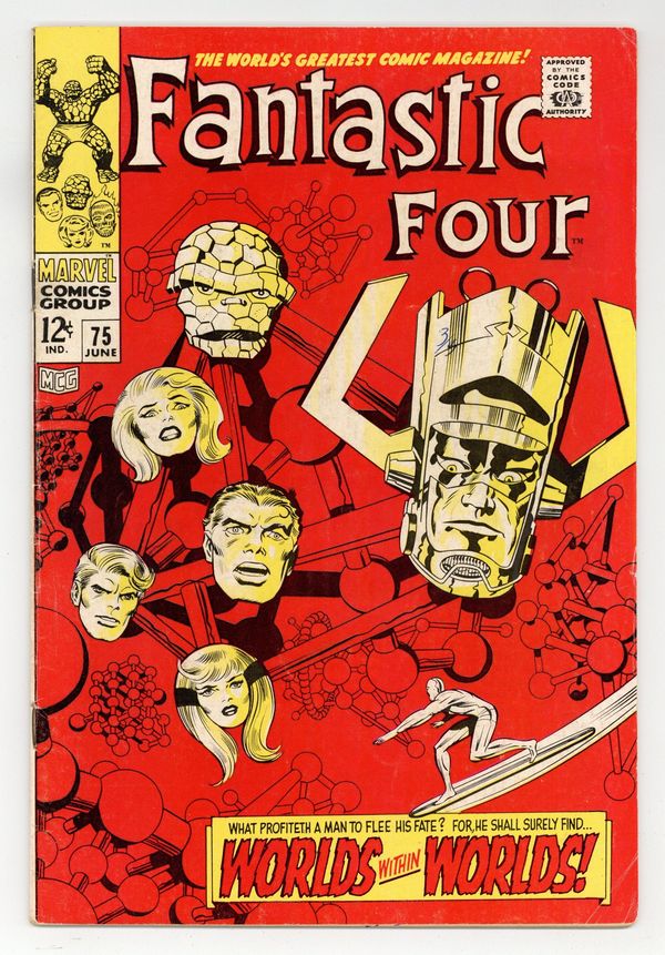 Cover pencils by Jack Kirby, inks by Joe Sinnott. The Silver Surfer, Galactus, and Crystal (of the Inhumans) guest star in Worlds Within Worlds!, script by Stan Lee and Jack Kirby (co-plot), pencils by Jack Kirby, inks by Joe Sinnott; Reed, Ben, and Johnny battle their dopplegangers, created by Galactus, who is determined to learn the location of the Silver Surfer. Reprinted in Marvel's Greatest Comics # 57. 36 pgs. $0.12. Cover price $0.12. Grade: GD/VG 3.0 explanation of grade Condition: Used (collectible)