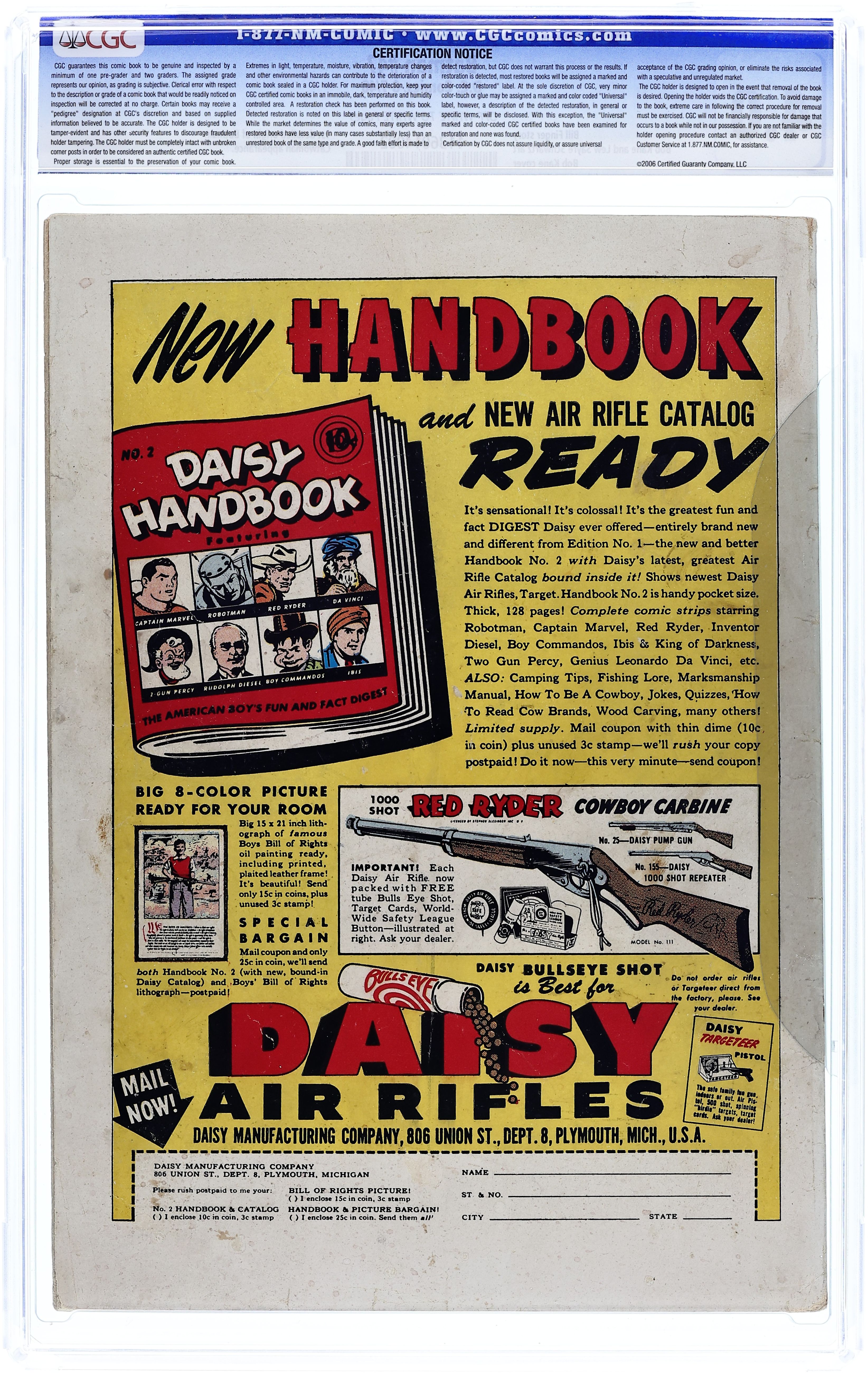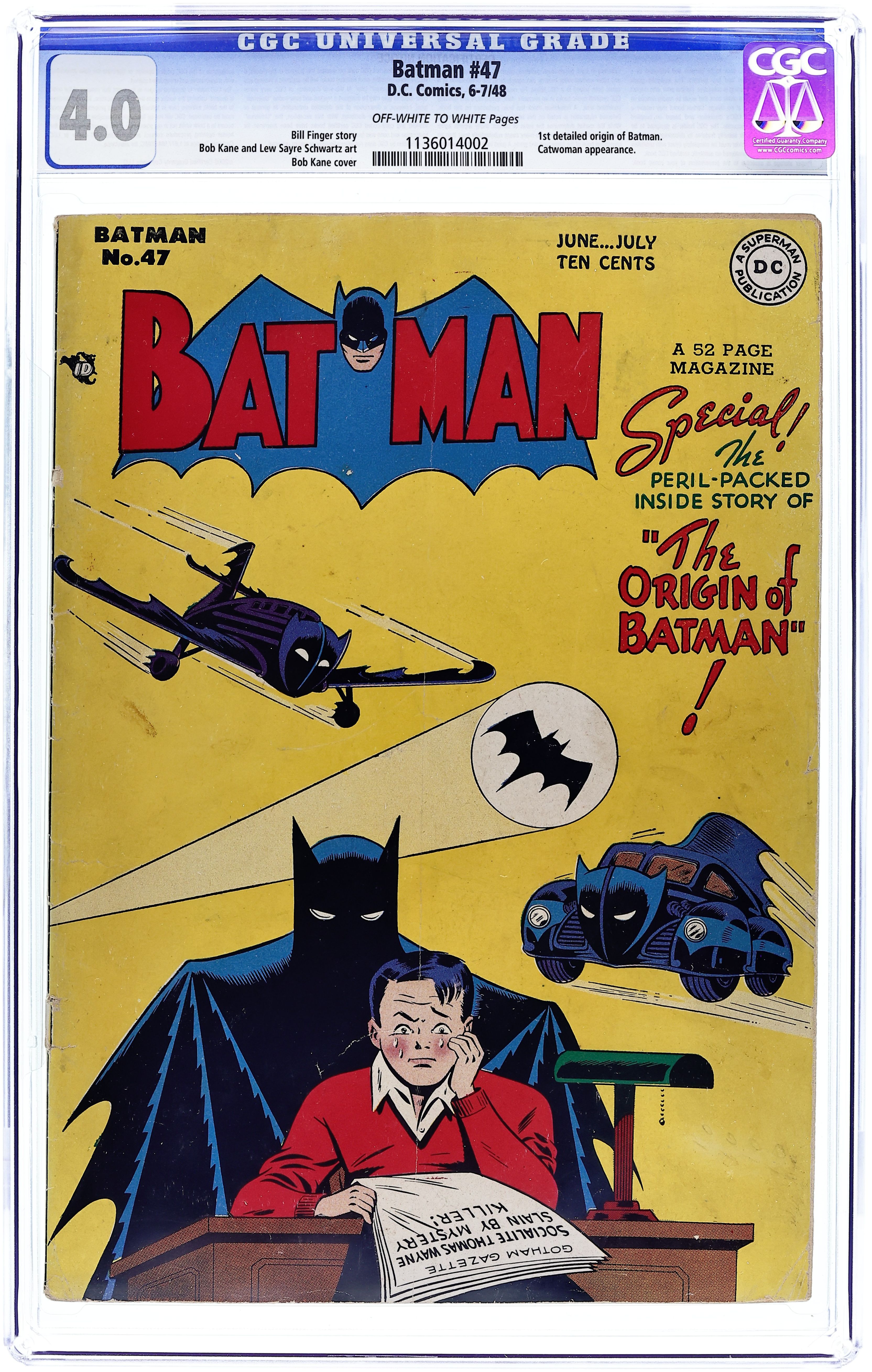 Starts Jul 4 Cover pencils by Bob Kane, inks by Charles Paris. In this key issue, Batman's origin is explored in detail for the first time in "The Origin of Batman!" in which Batman tracks down the killers of his mother and father. In this same story, the Bat Signal also used for the first time; script by Bill Finger, pencils by Bob Kane, inks by Charles Paris. "Fashions in Crime!", script by Bill Finger, pencils by Bob Kane (Batman and Robin figures only) and Lew Sayre Schwartz, inks by Charles Paris; Catwoman breaks out of jail in a spectacular way and as soon as she is free again, she realizes that she could use the fashion trends as her new crime theme; Posing as the manager of an important fashion magazine, Catwoman is granted access to the houses of many wealthy people and later she steals from them; Batman and Robin intervene. "The Chain Gang Crimes!", script by Bill Finger, pencils by Bob Kane (Batman and Robin figures only) and Lew Sayre Schwartz, inks by Charles Paris; In pursuit of bank robbers, Batman and Robin chase them to a side street where they suddenly disappear. "The Adventures of Popsicle Pete and Bob Feller" ad. "Winged Justice" text story by Ted Rosen, art by Raymond Perry. One-page Daffy & Doodle story by Lit-Win. One-page Little Pete story by Henry Boltinoff. 52 Pages, Full Color. Cover price $0.10. Grade: CGC 4.0 explanation of grade Condition: Used (collectible)