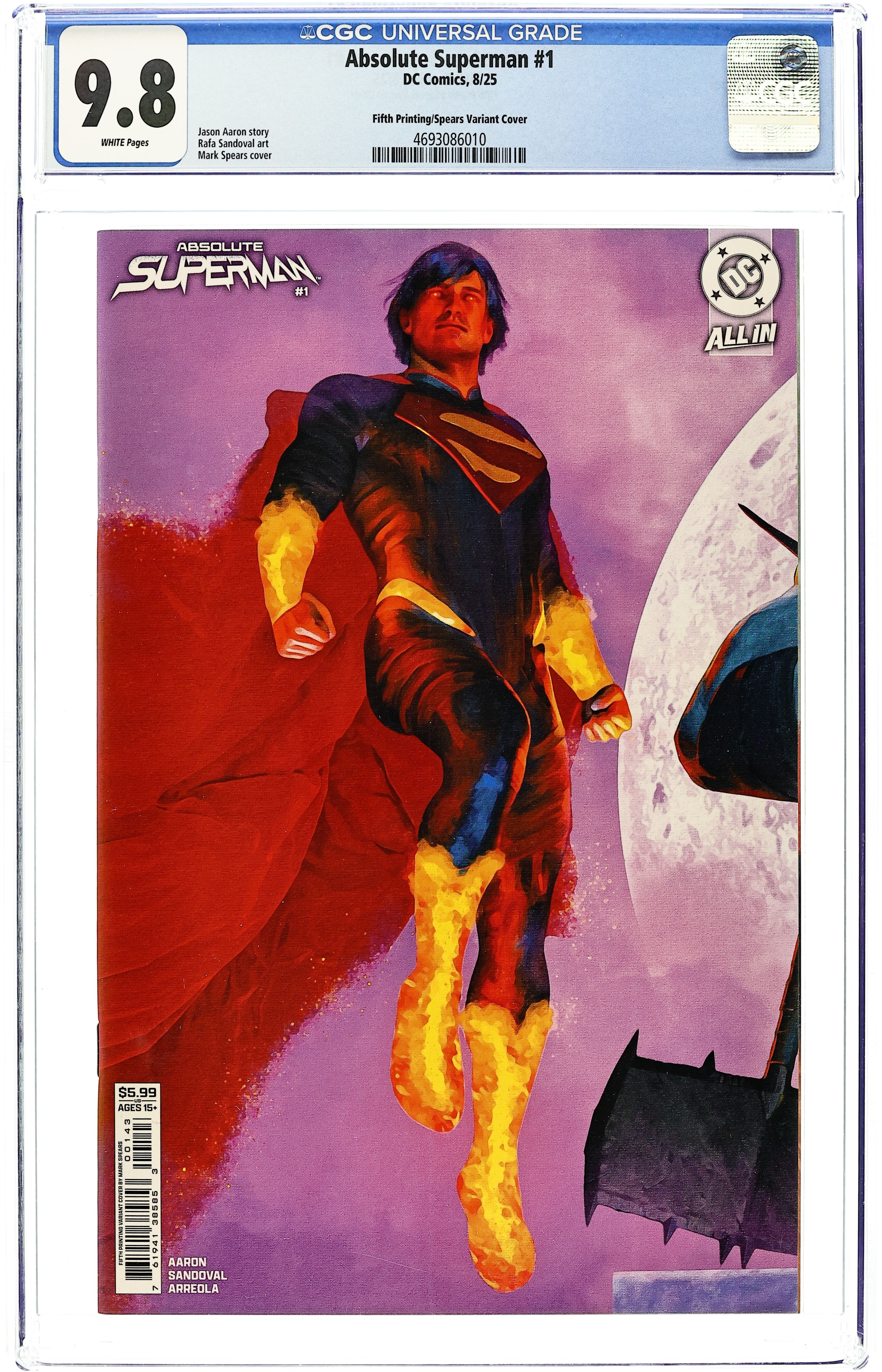 Starts May 11 5th Printing. Cover B. Written by Jason Aaron. Art by Rafa Sandoval. Cover by Mark Spears. SUPERSTARS JASON AARON AND RAFA SANDOVAL UNLEASH A SHOCKING NEW TAKE ON THE LAST SON OF KRYPTON! Without the fortress...without the family...without a home...what's left is the Absolute Man of Steel! 48 pages, full color. Rated T+ Cover price $4.99. Grade: CGC 9.8 explanation of grade Condition: Used (collectible) unless item is a new release