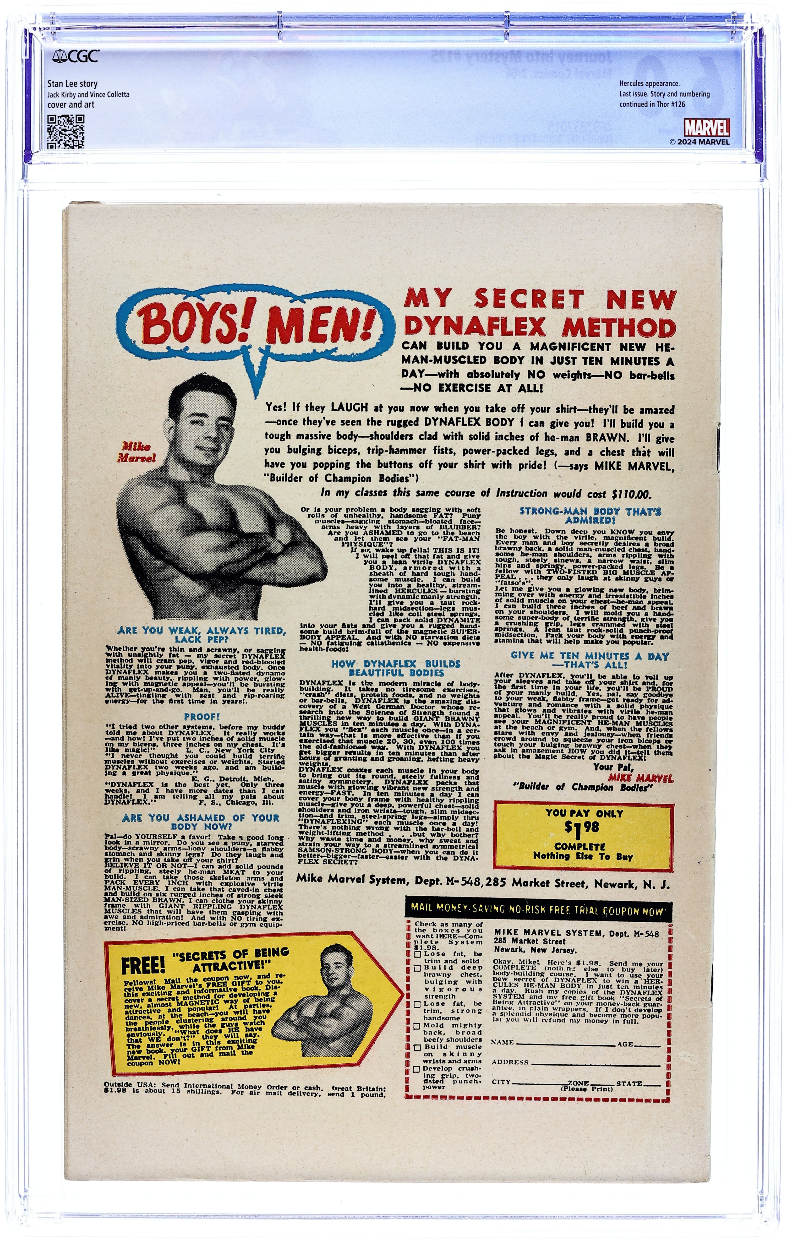 Starts May 11 Cover pencils by Jack Kirby, inks by Vince Colletta. "When Meet the Immortals!", script by Stan Lee, pencils by Jack Kirby, inks by Vince Colletta; Thor grapples with "The Demon" to recover the Norn Stone, while Hercules blunders about the world of Man, crossing paths with Jane Foster. Marvel Bullpen Bulletins. Tale of Asgard: "The Queen Commands," script by Stan Lee, pencils by Jack Kirby, inks by Vince Colletta; Thor's plans for a peaceful parlay with the Flying Trolls is dashed when Loki unleashes a poison gas on them! Ad for Hulk Sweat Shirt, Spider-Man Pin-Up, Super-Hero Stationery Kit, and Thor T-Shirt. 36 pgs., full color. $0.12. Cover price $0.12. Grade: CGC 6.0 explanation of grade Condition: Used (collectible)