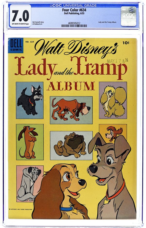 Starts May 11 Stories by Del Connell. Art and Cover by Al Hubbard. Walt Disney's Lady and the Tramp Album. Featuring the tales "Across the Tracks," "Pedro & Tuffy, Bringing Home the Bones," "Trusty & Jock, The Case of the Missing Bones," "Peg & Bull, Homeless" and "Boris & Dachsie, Everybody's Got a Trouble"! Starring Lady, Tramp, Pedro, Tuffy, Chiquita, Trusty, Jock, Peg, Bull, Boris and Dachsie! 36 pages, full color. Cover price $0.10. Grade: CGC 7.0 explanation of grade Condition: Used (collectible)