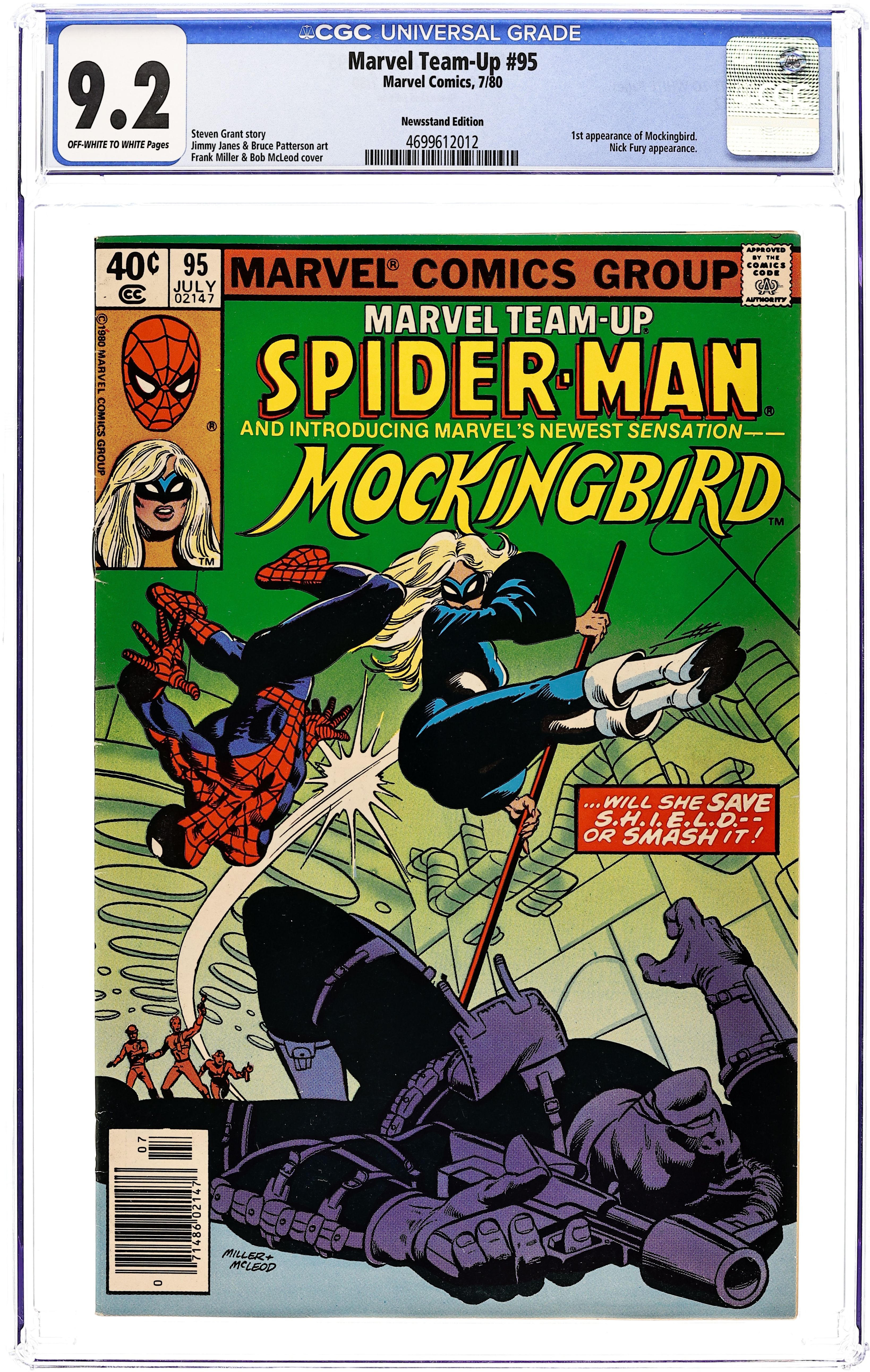 Starts May 11 Newsstand Edition. "And No Birds Sing!" Guest-starring Spider-Man and Mockingbird (1st appearance). Script by Steven Grant. Art by Jimmy James (breakdowns) and Bruce Patterson (finishes). Cover by Frank Miller and Bob McLeod. A rogue SHIELD branch director tricks the web-slinger into believing that Nick Fury's life is in jeopardy! Specifically, from a former SHIELD operative...Barbara Morse! However, Mockingbird is actually trying to save Nick Fury. Will Spider-Man realize that in time? First appearance of Bobbi Morse as Mockingbird. (Notes: After a cameo appearance in Contest of Champions 1, Mockingbird appears next in the first Hawkeye Limited Series published in 1983. The letters page contains a brief essay from Mark Gruenwald about the creation of Mockingbird.) 36 pages. Cover price $0.40. Grade: CGC 9.2 explanation of grade Condition: Used (collectible)