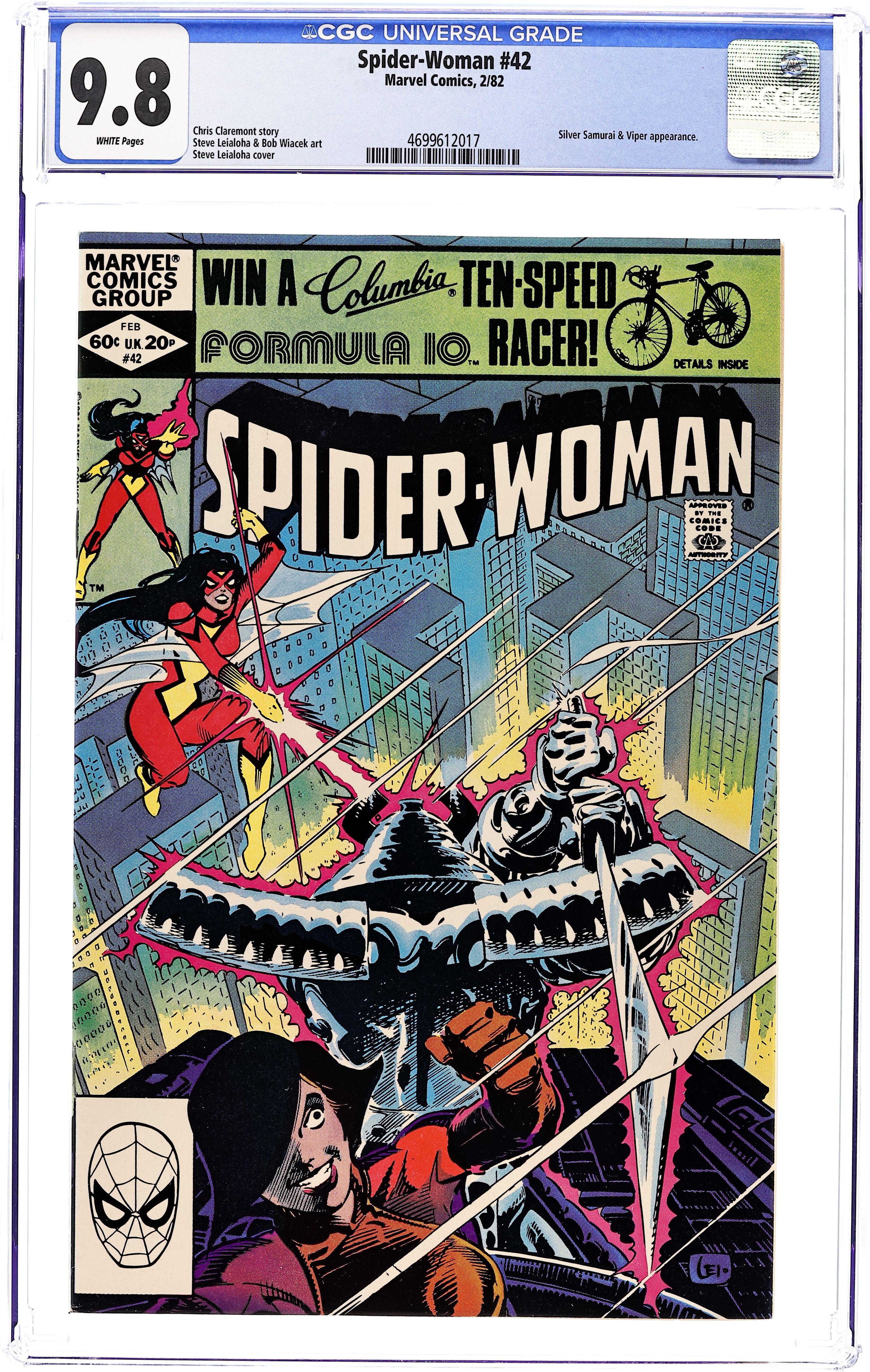 Starts May 11 Cover art by Steve Leialoha. The Judas Man, script by Chris Claremont, pencils by Steve Leialoha, inks by Bob Wiacek; Spider-Woman battles the Silver Samurai; Viper also featured. 36 pgs. $0.60. Cover price $0.60. Grade: CGC 9.8 explanation of grade Condition: Used (collectible)