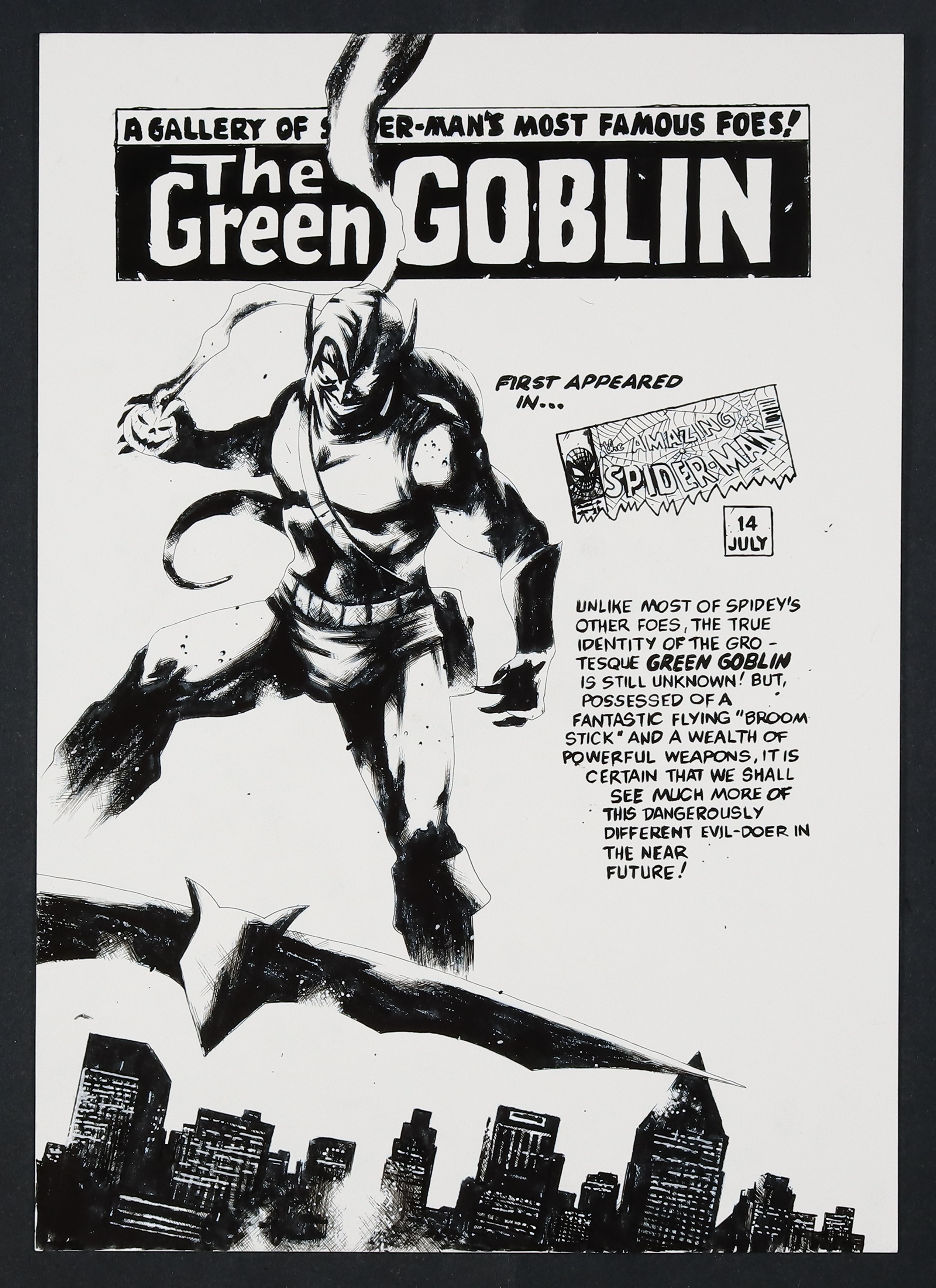 A beautiful recreation from House whose combination of brushwork and crosshatching lends some great texture to this iconic image of one of Spidey's most troublesome foes! Blue line pencil and ink on art board. 11 3/4" x 16 1/2".