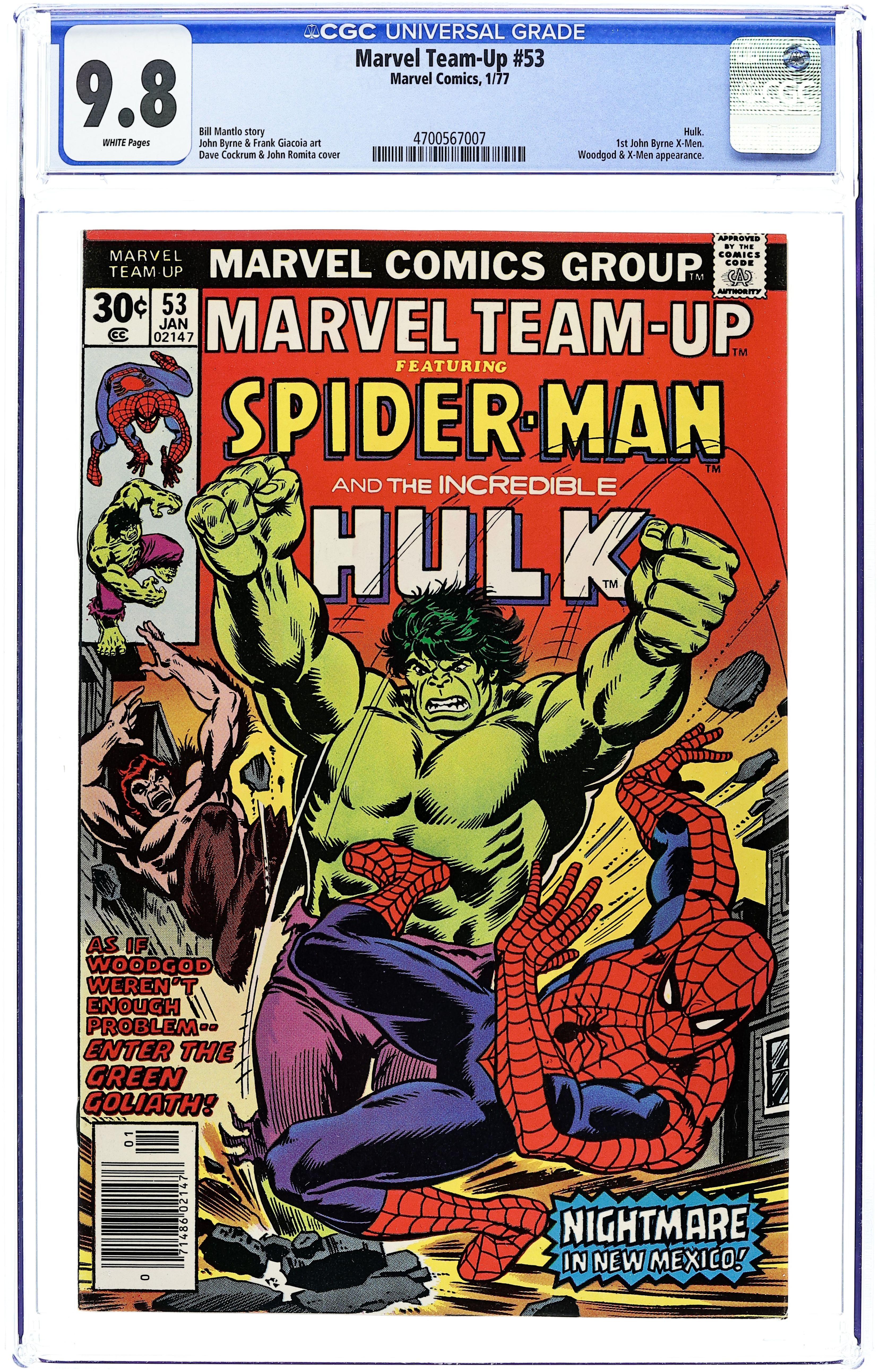 "Nightmare in New Mexico!" Part 1 of 3. Guest-starring Spider-Man and the Hulk. Script by Bill Mantlo. Pencils by John Byrne (1st work on the X-men). Inks by Frank Giacoia. Cover by Dave Cockrum. The Uncanny X-Men and the web-slinger are flying back home after their adventure in Marvel Team-Up Annual 1, when they suddenly spot a titanic battle raging down below between the Incredible Hulk and Woodgod! What has brought the green goliath and Woodgod to the Land of Enchantment? Spider-Man volunteers to investigate...and he may live to regret it! Cameo appearances by Professor Xavier and the X-Men (Banshee, Colossus, Cyclops, Nightcrawler, Phoenix, Storm, Wolverine). (Notes: This issue features John Byrne's first artwork on the X-men. Woodgod previously appeared in Marvel Premiere 31. The letters page includes a letter from comics cartoonist Fred Hembeck.) 36 pages. Cover price $0.30. Grade: CGC 9.8 explanation of grade Condition: Used (collectible)