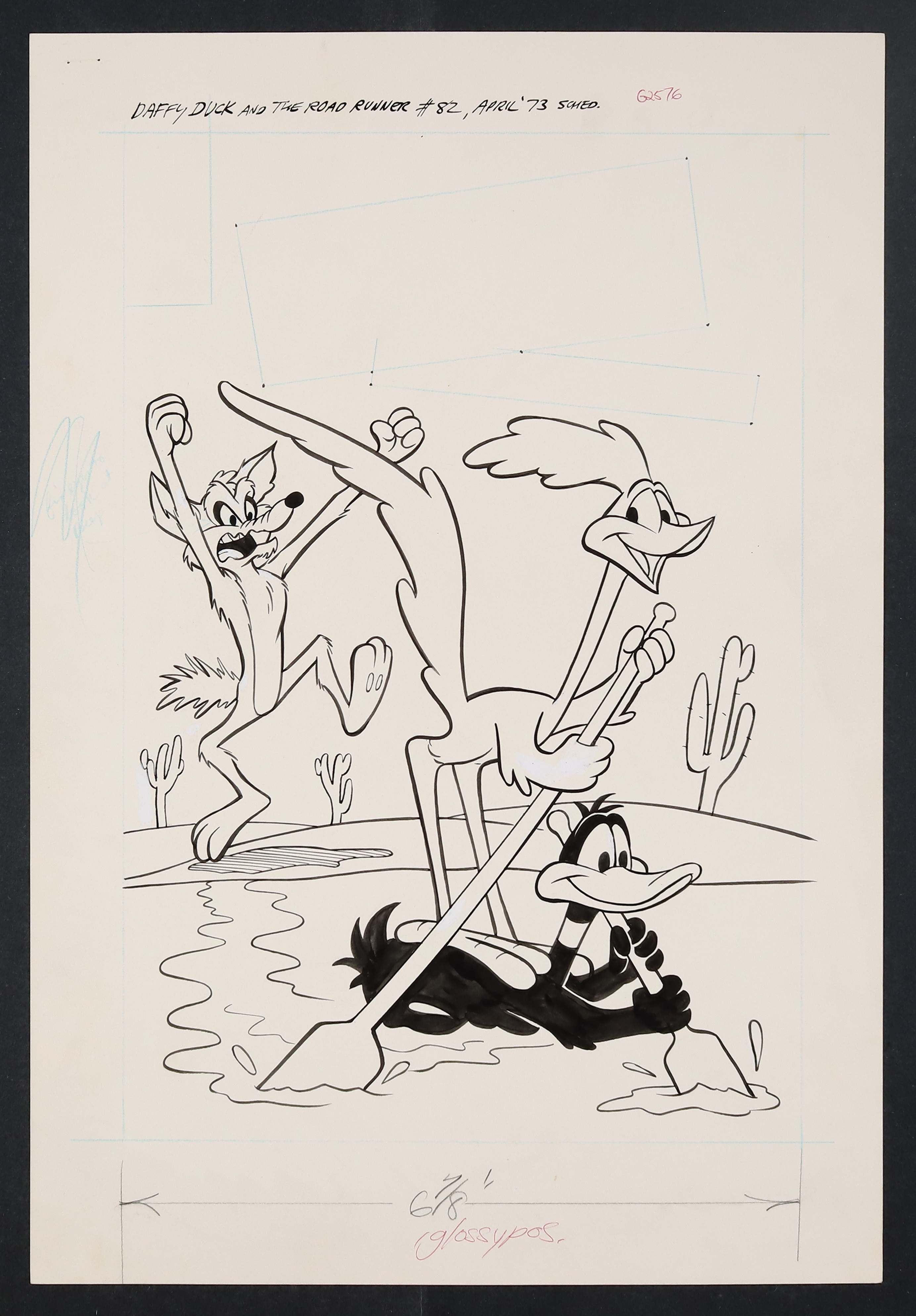 Avian solidarity! For the last of the 10 issues of this series to give Road Runner title billing alongside Daffy Duck, the two team up to thwart Wile E. Coyote on this fantastic Looney Tunes cover. Pencil and ink on art board. 13" x 19".