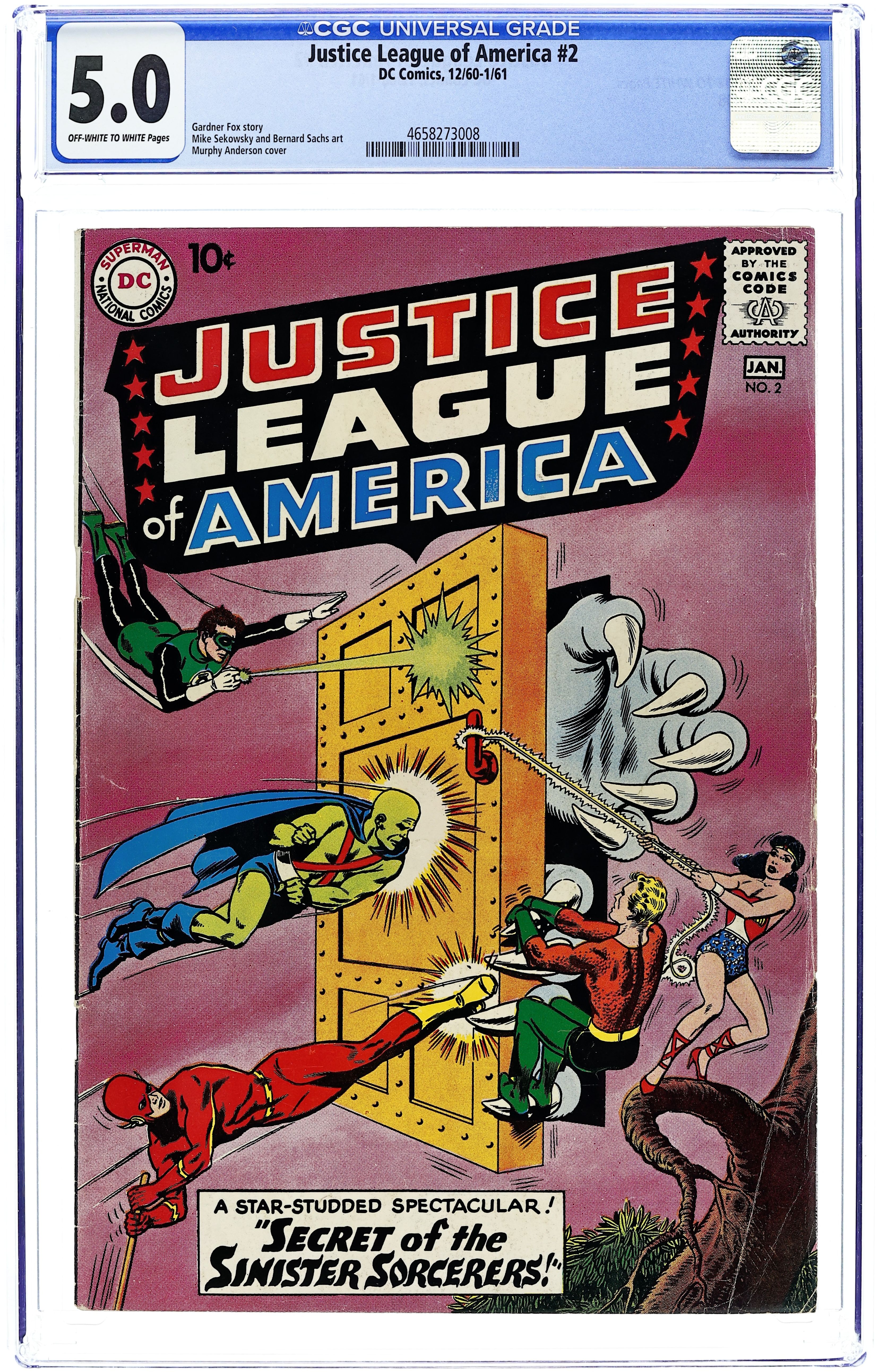 Cover art by Murphy Anderson. Secret of the Sinister Sorcerers!, Script by Gardner Fox, pencils by Mike Sekowsky, inks by Bernard Sachs; all man-made inventions in the world stop functioning; the Justice League summons Merlin from the Magic Dimension to help find a way to restore Earth to normal. Letter to the editor from writer Jerry Bails. 36 pgs. $0.10. Cover price $0.10. Grade: CGC 5.0 explanation of grade Condition: Used (collectible)