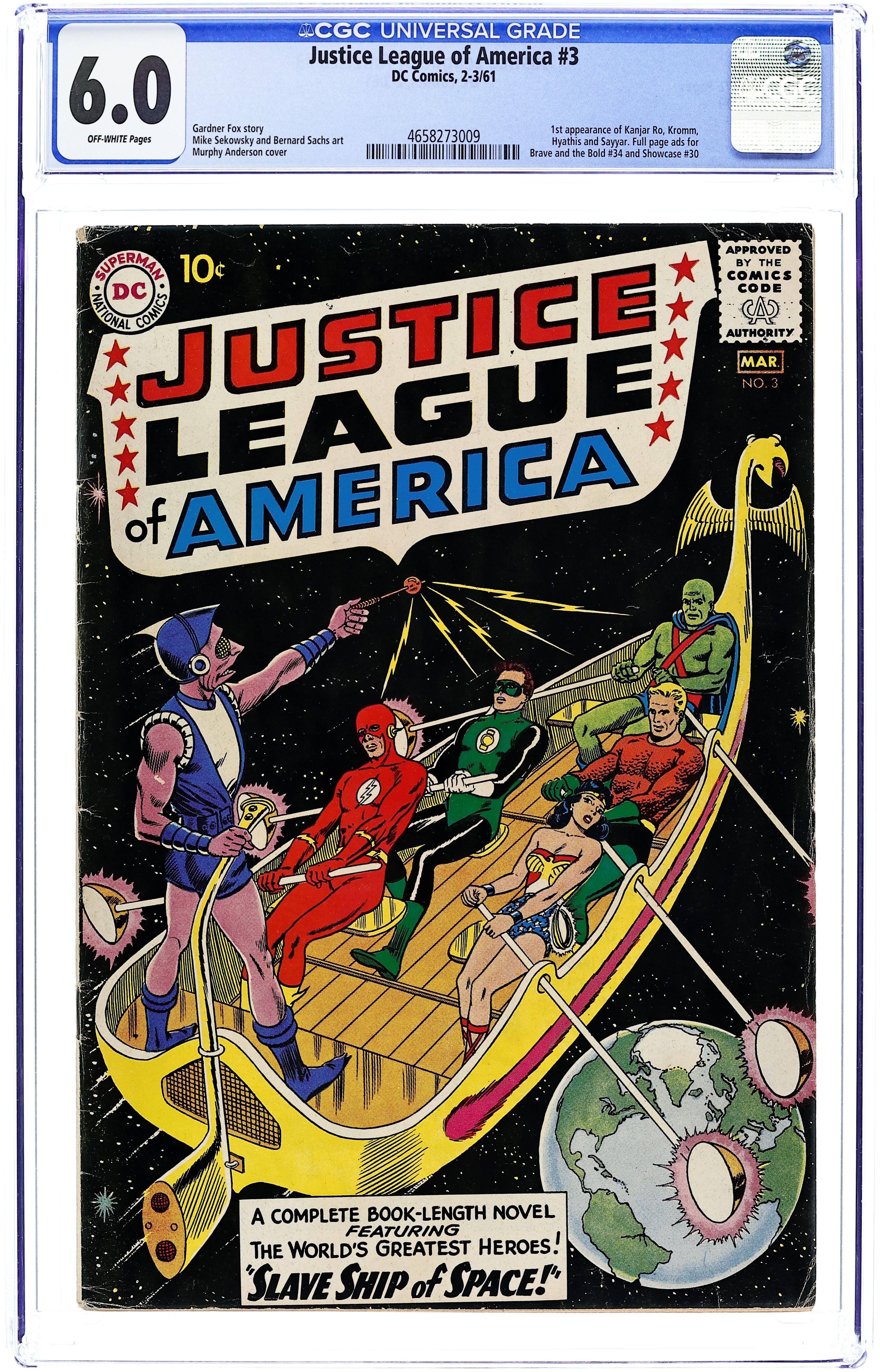 Cover art by Murphy Anderson. The Slave Ship of Space!, script by Gardner Fox, pencils by Mike Sekowsky, inks by Bernard Sachs; Kanjar Ro forces the Justice League to help him defeat his enemies by freezing the people of Earth motionless. Only the combined voices of his enemies--Kromm, Hyathis, and Sayyar--saying "Kanjar Ro" can release them. 36 pgs. $0.10. Cover price $0.10. Grade: CGC 6.0 explanation of grade Condition: Used (collectible)