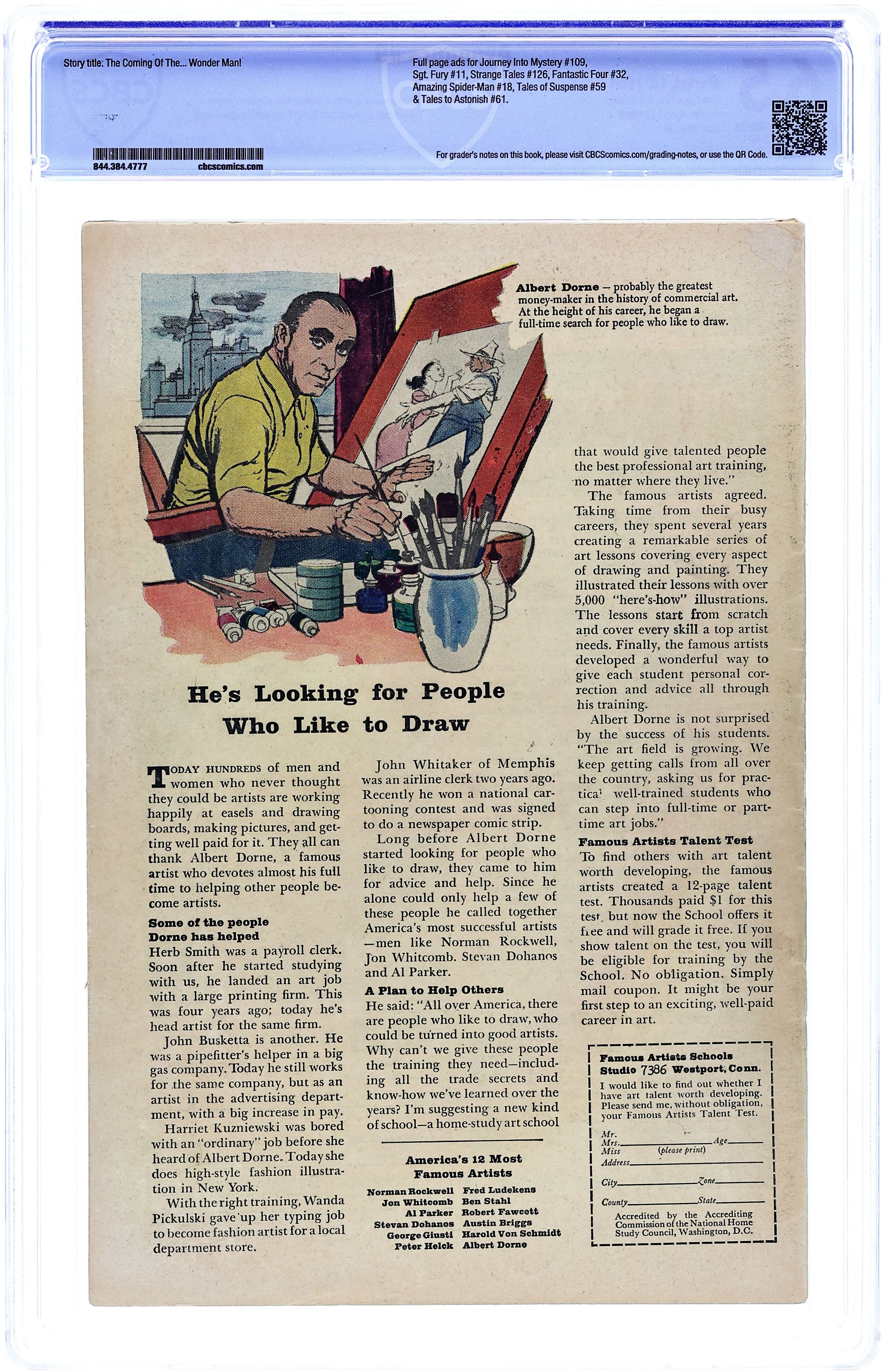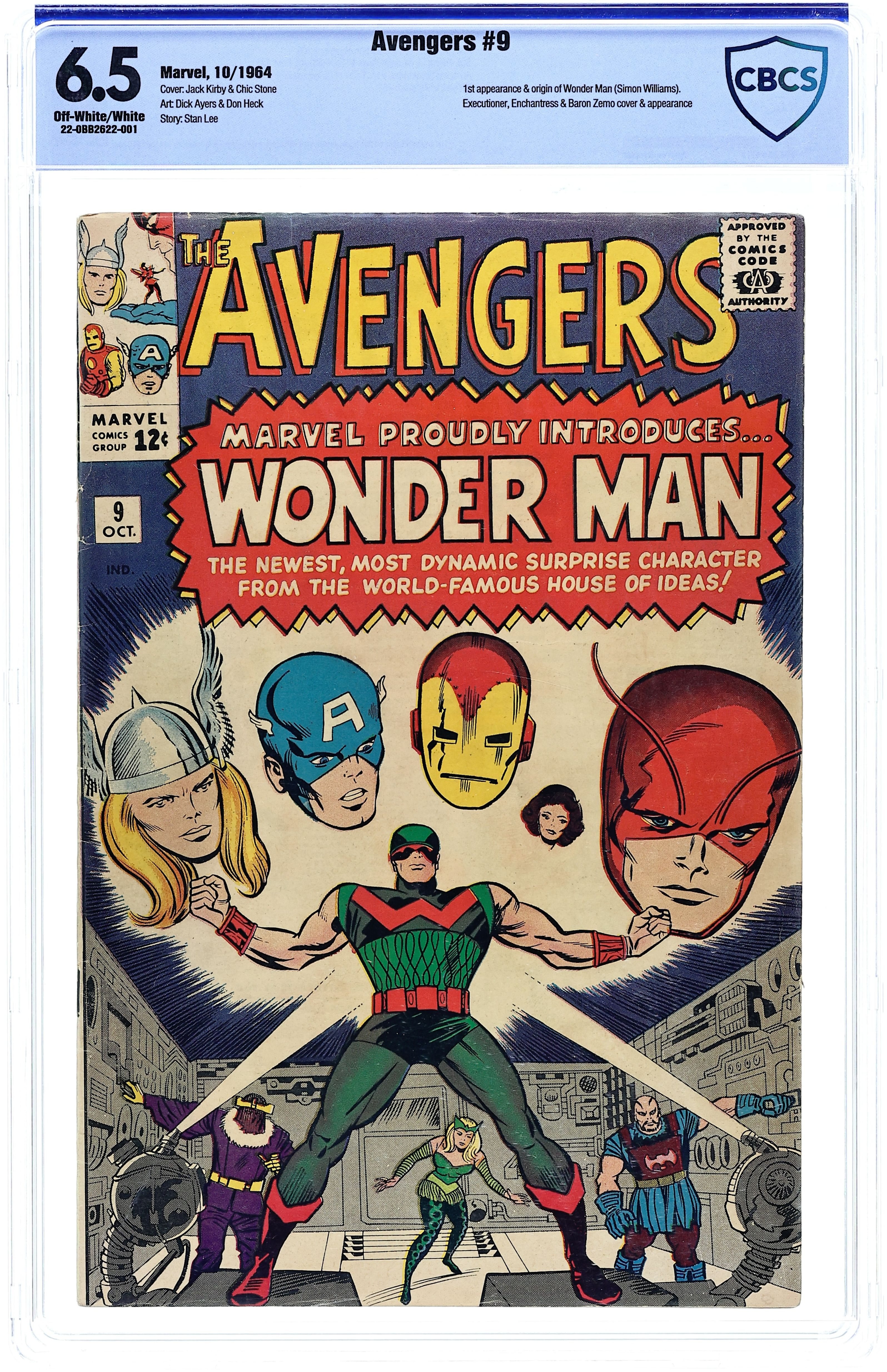 Starts May 18 Cover pencils by Jack Kirby, inks by Chic Stone. First appearance of Wonder Man in "The Coming of the... Wonder Man!", script by Stan Lee, pencils by Don Heck, inks by Dick Ayers; Baron Zemo and the Masters of Evil transform Simon Williams into Wonder Man and send him to infiltrate the Avengers; Instead, he winds up allying with them at the cost of his own life. Roster: Captain America, Thor, Iron Man, Giant-Man, and the Wasp. Villains: Executioner, the Enchantress, and Baron Zemo. Cameo appearance by Bucky. 36 pgs., full color. $0.12. Cover price $0.12. Grade: CBCS 6.5 explanation of grade Condition: Used (collectible)
