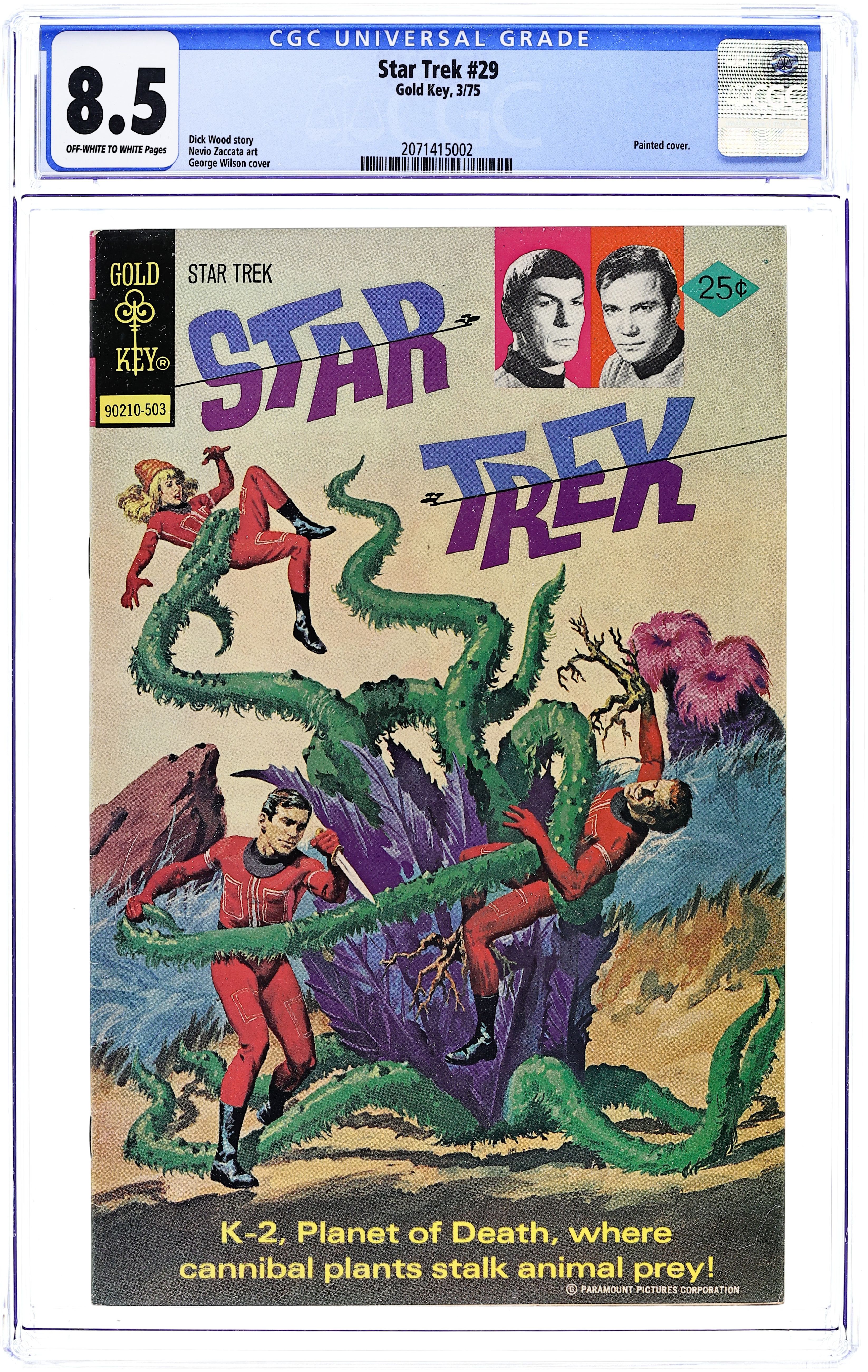 Starts May 11 Comic book version of the original Star Trek TV series that starred William Shatner and Leonard Nimoy. 90210-503. Painted cover by George Wilson, with inset photos of William Shatner as Kirk and Leonard Nimoy as Spock. "The Planet of No Return," script by Dick Wood, art by Nevio Zaccata; the Enterprise crew is on K-2, Planet of Death, where cannibal planets stalk animals. 36 pgs., full color. $0.25. Cover price $0.25. Grade: CGC 8.5 explanation of grade Condition: Used (collectible)