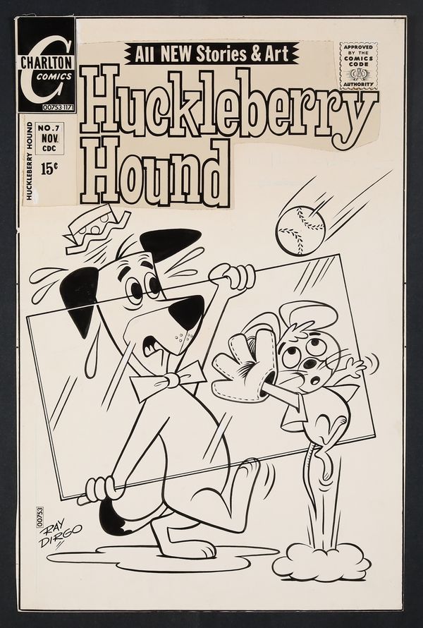A classic cartoon scenario is in motion on this fun cover as Dixie (sans Pixie) leaps to catch a baseball as, for some reason, Huckleberry Hound just so happens to be moving a pane of glass behind him. Pencil and ink with original title pasteups on art board. 12 3/4" x 19 1/4".