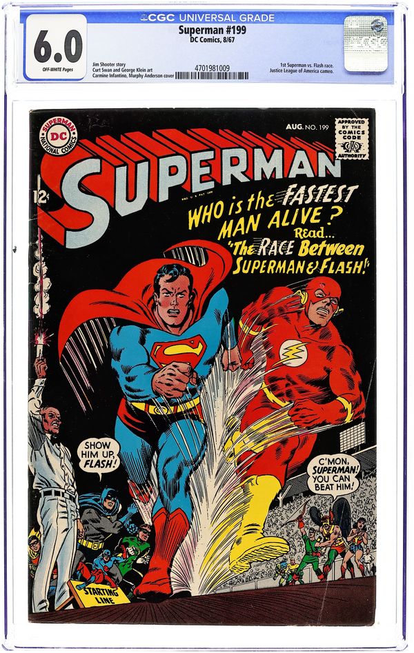 Starts Jul 4 1st Superman vs. Flash race. Cover pencils by Carmine Infantino, inks by Murphy Anderson. Superman's Race With the Flash!, script by Jim Shooter, pencils by Curt Swan, inks by George Klein; a very close race by the two fastest super-heroes; brief Justice League appearance; the first Superman/Flash race. 36 Pages, Full Color. Cover price $0.12. Grade: CGC 6.0 explanation of grade Condition: Used (collectible)