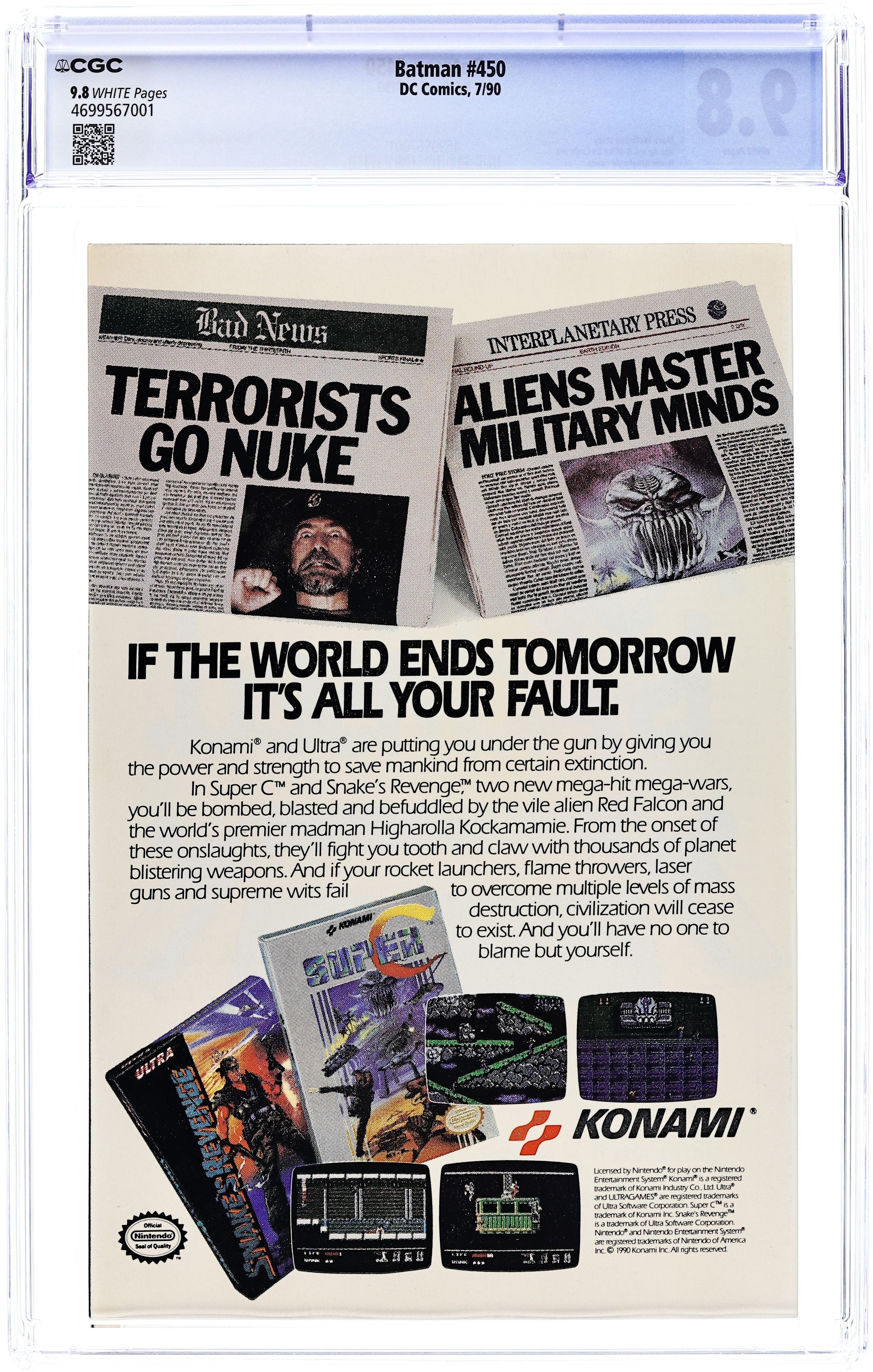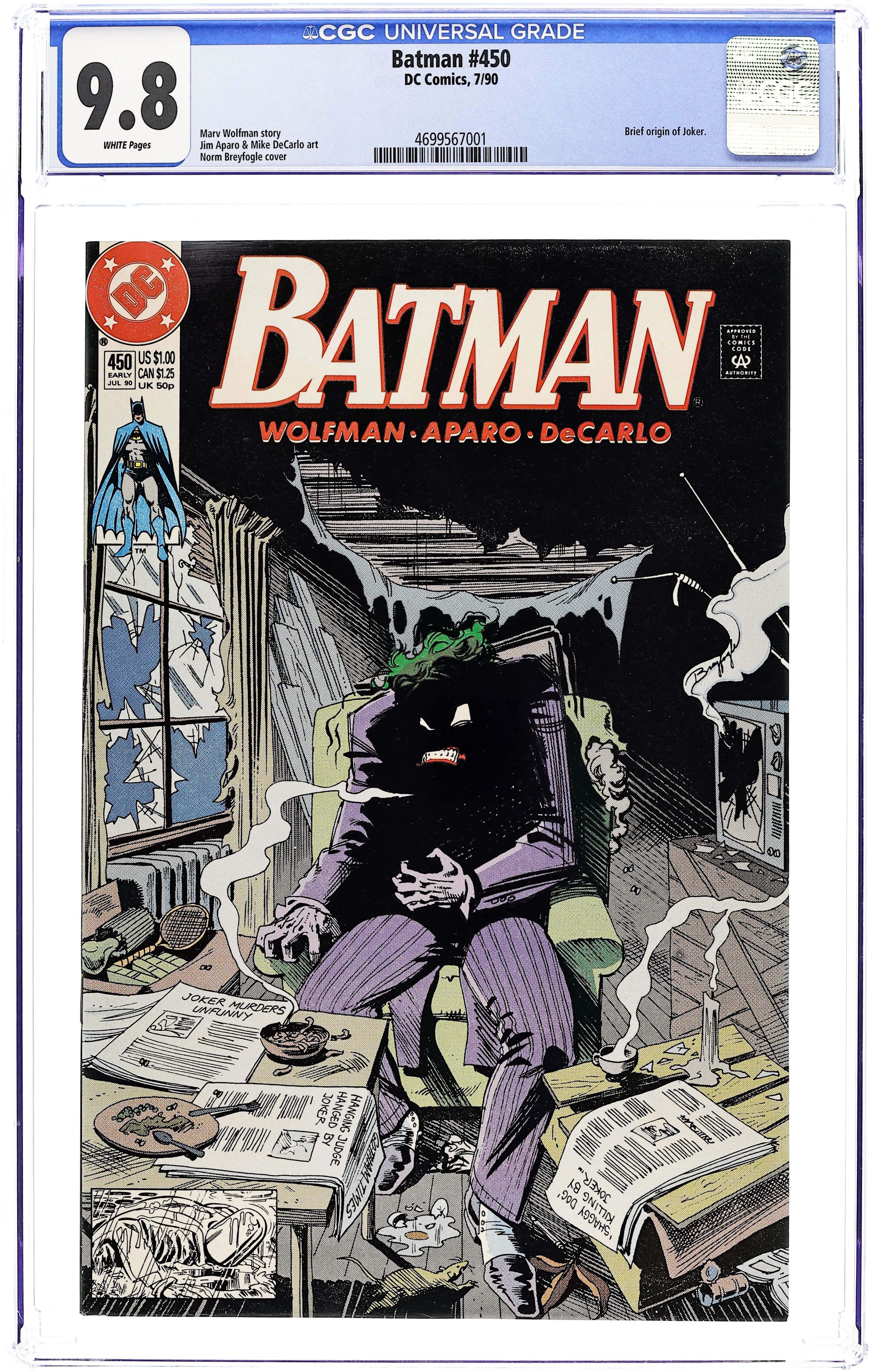 Starts May 11 Direct Edition. Unable to see the humor in things of a criminal nature, the Joker tries to find the joke again in "Wildcard!" Part 1 of 2, continued next issue. Written by Marv Wolfman. Art by Jim Aparo & Mike DeCarlo. Cover by Norm Breyfogle. 36 Pages, Full Color. Cover price $1.00. Grade: CGC 9.8 explanation of grade Condition: Used (collectible)