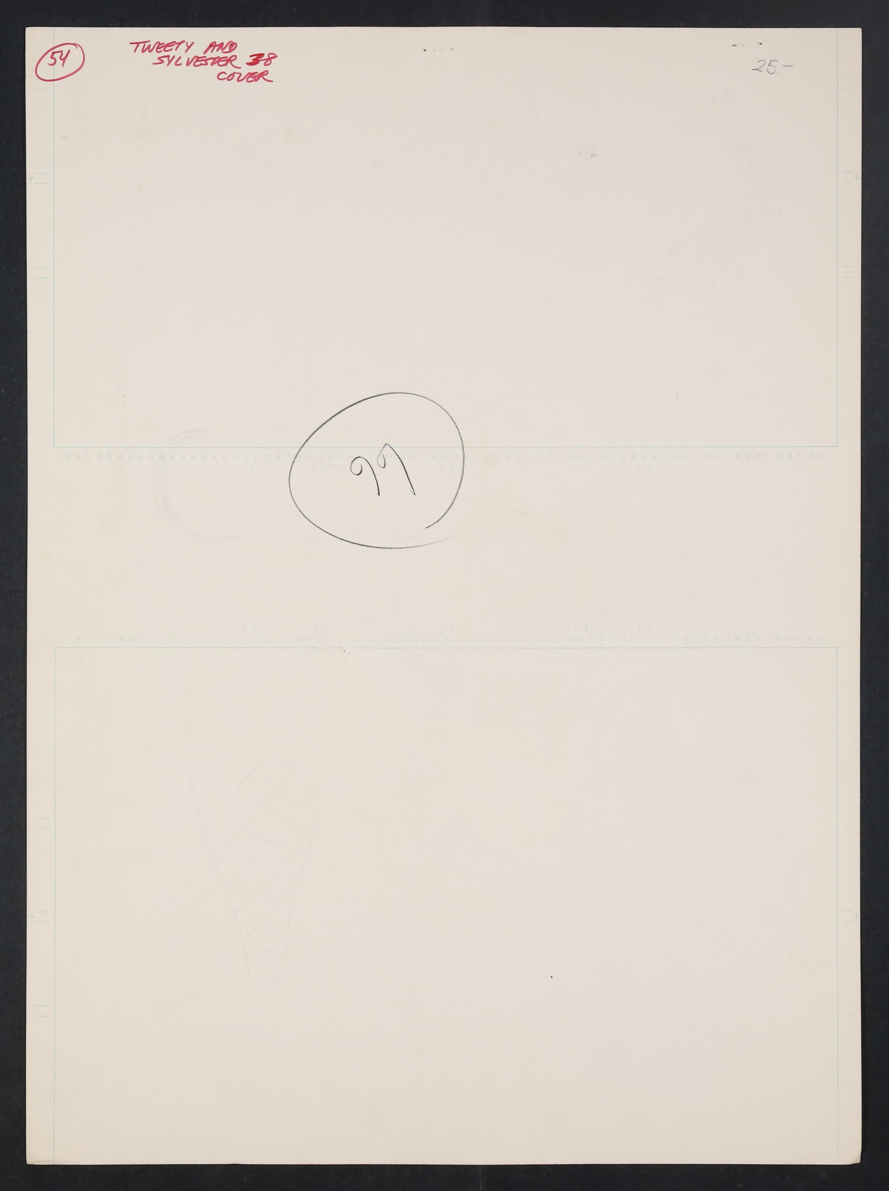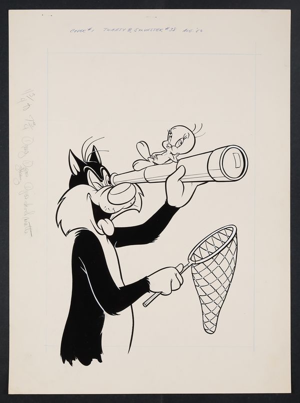 One of Looney Tunes' most notable pair of rivals display their dynamic poifectly here on this cover in a pitch perfect scenario for the two. Pencil and ink on art board. 14 1/2" x 20". NOTE: This cover is noted at the top as being intended for issue 38 of the series slated to be published in August of 1962, though the series ended in June with #37. As such this cover was pushed up and used for issue 36.