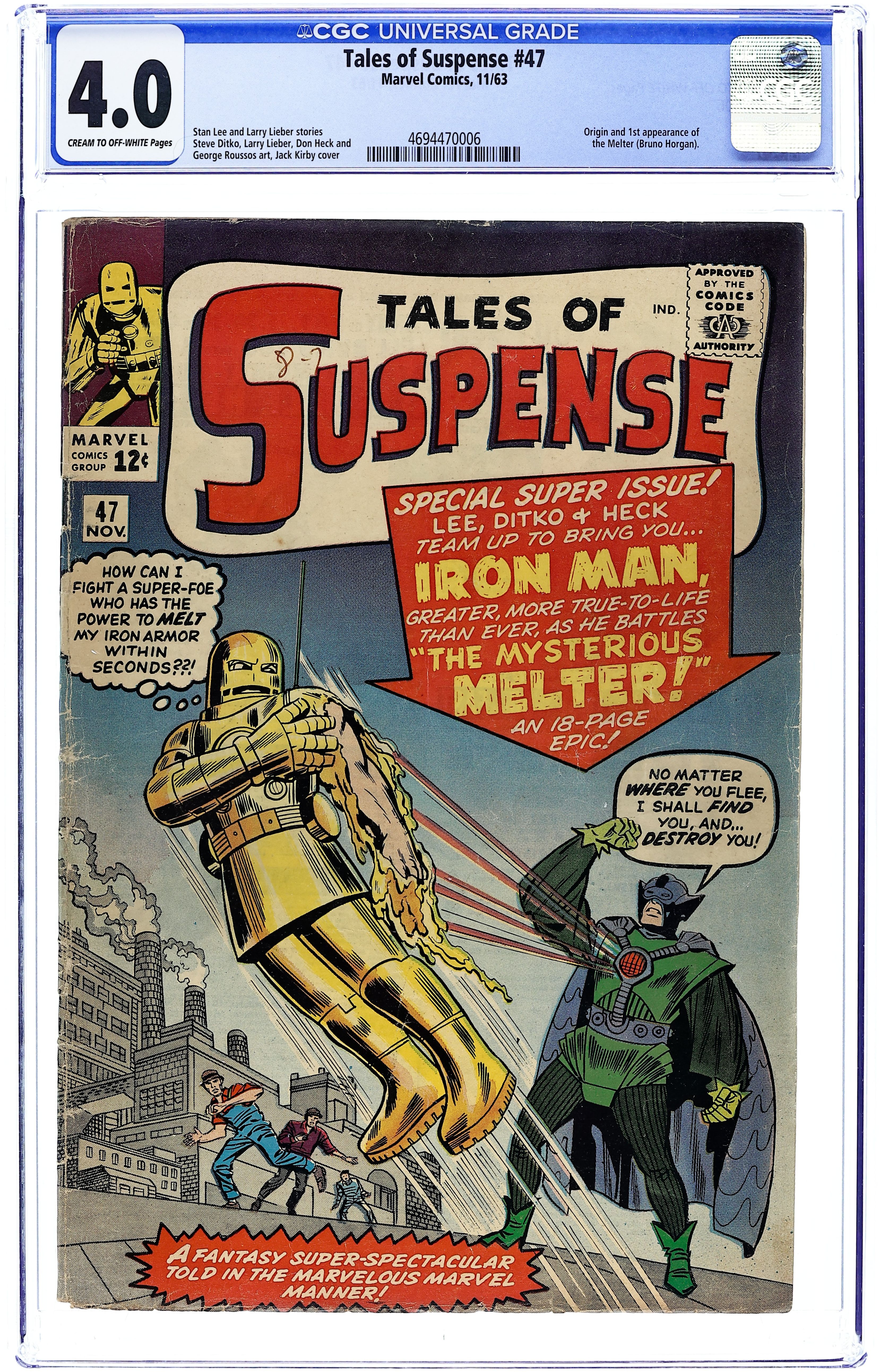 Cover pencils by Jack Kirby, inks by George Roussos. "Iron Man Battles the Melter!", script by Stan Lee, pencils by Steve Ditko, inks by Don Heck; A former competitor of Tony Stark becomes the Melter and sabotages one of his plants. Iron Man tries to defend it but must flee before the Melter; He defeats him by constructing an aluminum suit that he cannot melt. "The Green Man" text story. "Shock!", script by Stan Lee (plot) and Larry Lieber (script), pencils by Larry Lieber, inks by George Roussos (as G. Bell); A radar operator turns off Earth's defenses when alien raiders offer him the most beautiful woman in the universe. 36 pages, full color. Cover price $0.12. Grade: CGC 4.0 explanation of grade Condition: Used (collectible)