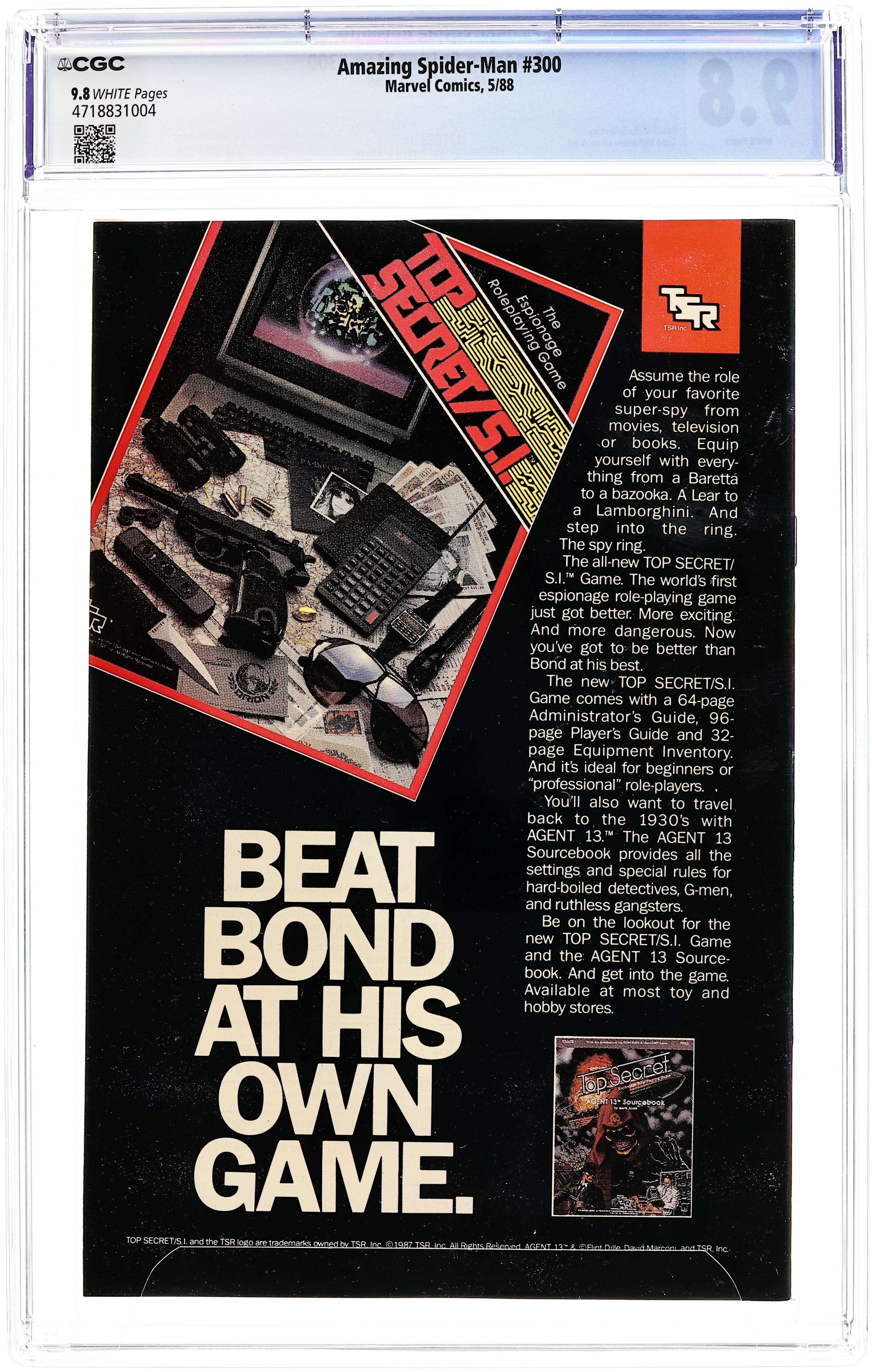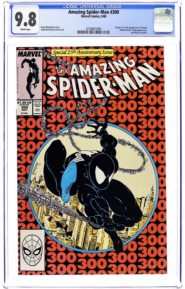 Direct Edition. Giant-sized 25th anniversary issue. First full appearance of Venom in "Venom!", script by David Michelinie, art by Todd McFarlane; Spidey's old alien costume has merged with reporter Eddie Brock who thinks his career was ruined by Spider-Man and the symbiote of the two, Venom, takes on the web slinger; At MJ's request, Spidey returns to the blue and red costume as she now finds his black duds way too creepy; This is the last issue in which Spider-Man appears in his black costume; Thing (of the Fantastic Four) cameo.. Stan's Soapbox Special in place of letters page: Full page editorial by Stan on the occasion of Spider-Man's 300th issue. 52 pgs., full color. Cover price $1.50. Grade: CGC 9.8 explanation of grade Condition: Used (collectible)