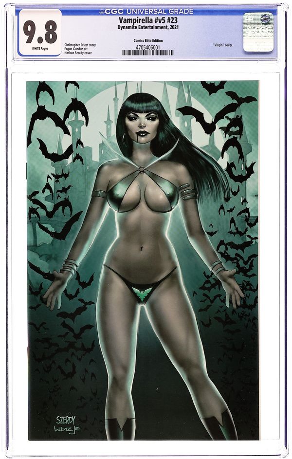 Comics Elite Exclusive Virgin Cover by Nathan Szerdy. Written by Christopher Priest. Art by Ergun Gunduz and Chris Graves. RED MASS, PART 1: The countdown to the most unholy union in history begins here! Having finally returned to Earth from her Interstellar adventure, Vampirella rescues a child from certain death while unwittingly giving life to the greatest evil the world has ever seen! The epic run of CHRISTOPHER PRIEST and ERGUN GUNDUZ is about to reach its crescendo! 16 pages, full color. Teen+ Grade: CGC 9.8 explanation of grade Condition: Used (collectible)