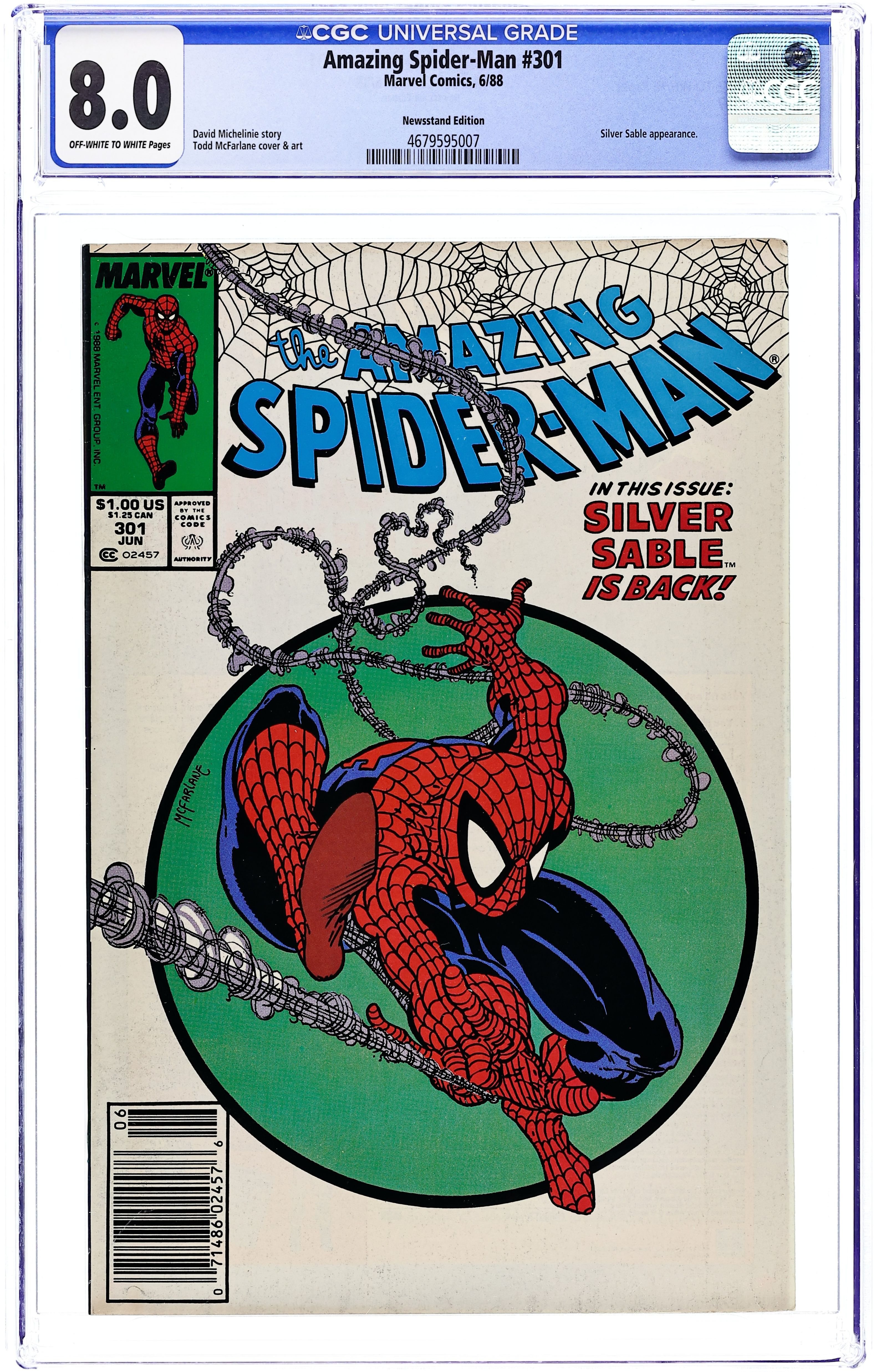 Newsstand Edition. "The Sable Gauntlet!" Guest-starring Silver Sable. Script by David Michelinie. Art by Todd McFarlane. Cover by Todd McFarlane. The first 300 issues of the Amazing Spider-Man are in the books after the web-slinger's epic battle vs. Venom last issue! And now the next chapter in the wall-crawler's anthology begins with an encounter with his favorite mercenary: Silver Sable! The enchanting sable agrees to make a test run through the security systems of a new high-rise office building, but deadly danger awaits on the top floor! Will Spidey catch the elevator in time? Cameo appearances by Mary Jane Watson and Dr. Morris Sloan. First $1.00 issue. (Notes: The cover is the same artwork (with different colors) as the cover to issue 300. This issue includes a full-page ad for the first appearance of Typhoid Mary in the Daredevil (1st) series -- art by John Romita Jr. and Al Williamson. The letters page contains a statement of ownership: average print run 469,913; average paid circulation 284,692.) 36 pgs. Cover price $1.00. Grade: CGC 8.0 explanation of grade Condition: Used (collectible)
