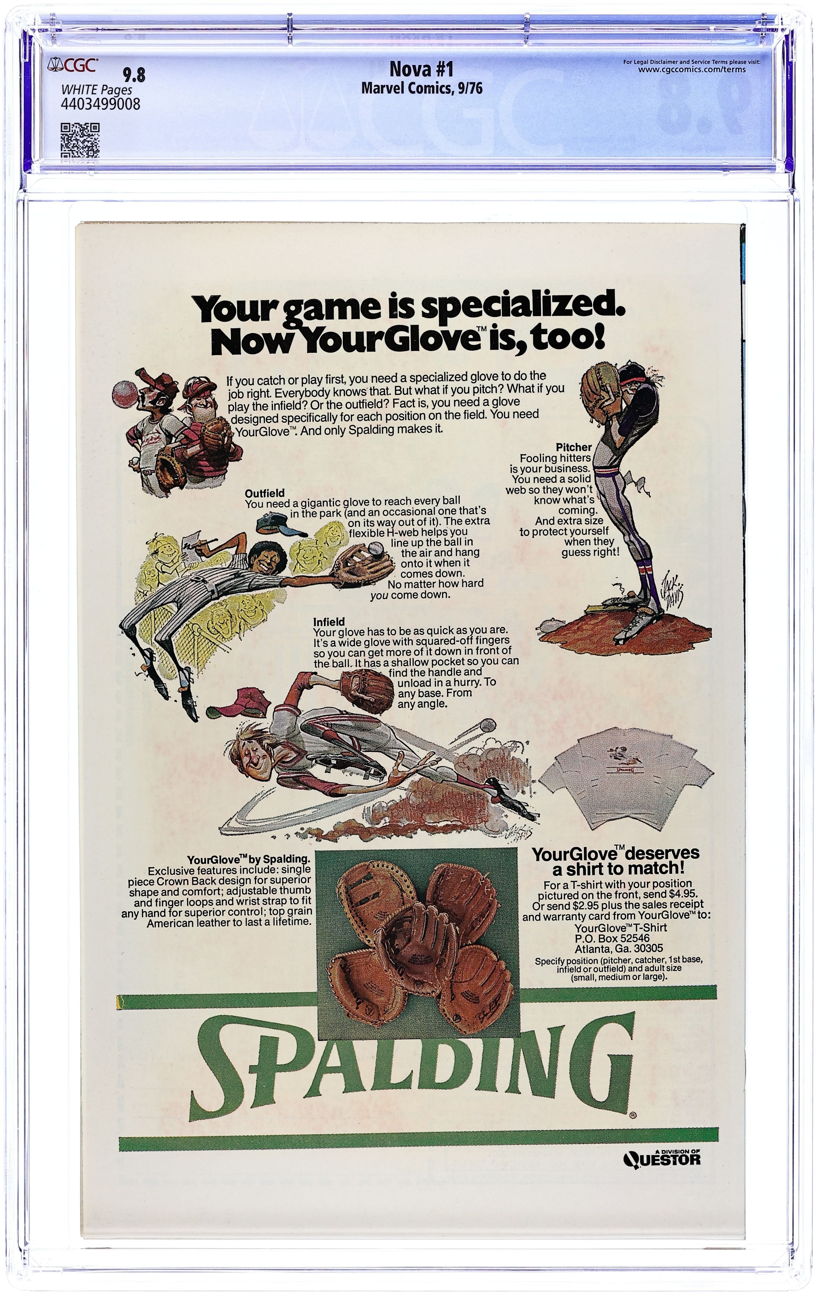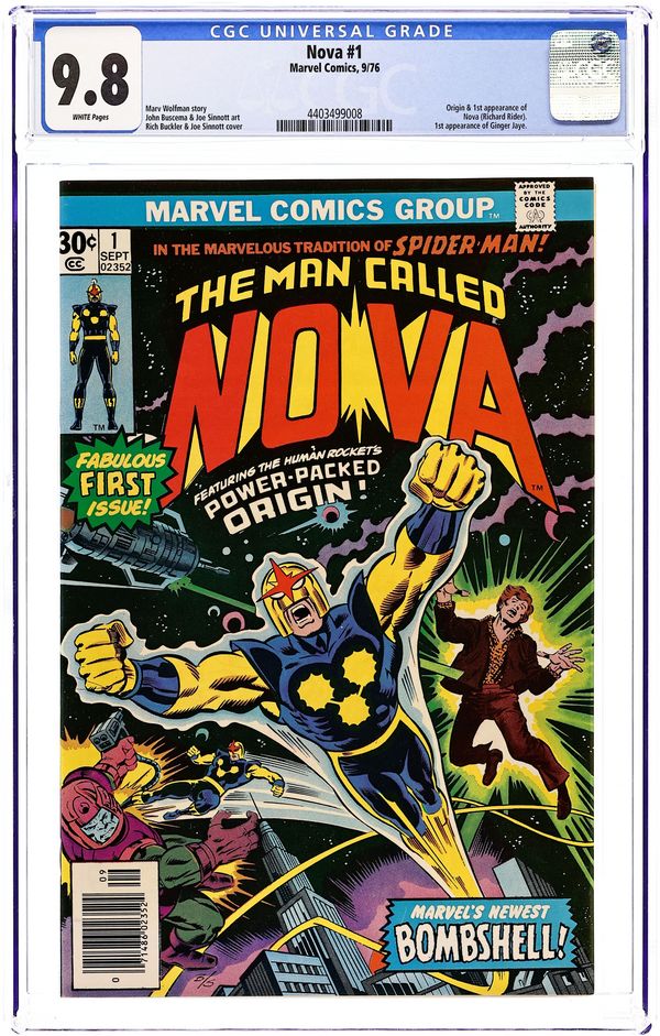 Written by Marv Wolfman. Pencils by John Buscema. Inks Joe Sinnott. When a dying alien passes on his super-powers to Earth teenager Richard Rider, Rider becomes the man called Nova, the human rocket! In the marvelous tradition of Spider-man, Nova must now stop the murderous alien known as Zorr, or Earth is doomed! Note: First appearance of Nova. 36 pages, full color. Cover price $0.30. Grade: CGC 9.8 explanation of grade Condition: Used (collectible)