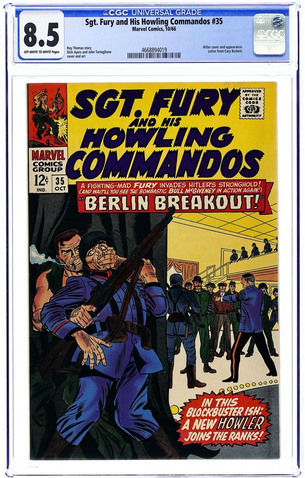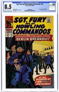 Cover pencils by Dick Ayers, inks by John Tartaglione. "Berlin Breakout!", script by Roy Thomas, pencils by Dick Ayers, inks by John Tartaglione; Captain Sawyer selects the members of the mission to rescue the Howlers, captured in Greece, who are bound for Berlin for a high-profile execution; Fury is given ex-Nazi Eric Koenig, Bull McGiveney, and his corporal, Rickets Johnson; They infiltrate the Berlin event with the help of Eric's sister, Ilsa, a double-agent working for the Nazis. They rescue the Howlers, but Dino Manelli is seriously wounded, and will not return to fight. Eric Koenig is named as his replacement. 36 pgs., full color. $0.12. Cover price $0.12. Grade: CGC 8.5 explanation of grade Condition: Used (collectible)