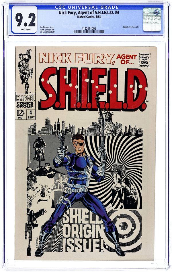 Cover by Jim Steranko. SHIELD origin retold in "And Now It Begins...', script by Roy Thomas (plot, dialogue) and Frank Springer (plot), art by Frank Springer; HYDRA repeatedly tries to murder Nick Fury before he can recruited to head SHIELD; The agent in charge of the operation, Agent L, is executed for his failure by Agent H; After reminiscing about his days in WW2, Fury meets Tony Stark, who introduces him to the SHIELD board of directors, then shows him a film detailing HYDRA's operations; After Fury uncovers a bomb in the room and dispatches it, along with the spy who planted it, he realizes the danger facing the free world and takes the job. Frank Springer's 1st Marvel work. 36 pgs., full color. $0.12. Cover price $0.12. Grade: CGC 9.2 explanation of grade Condition: Used (collectible)