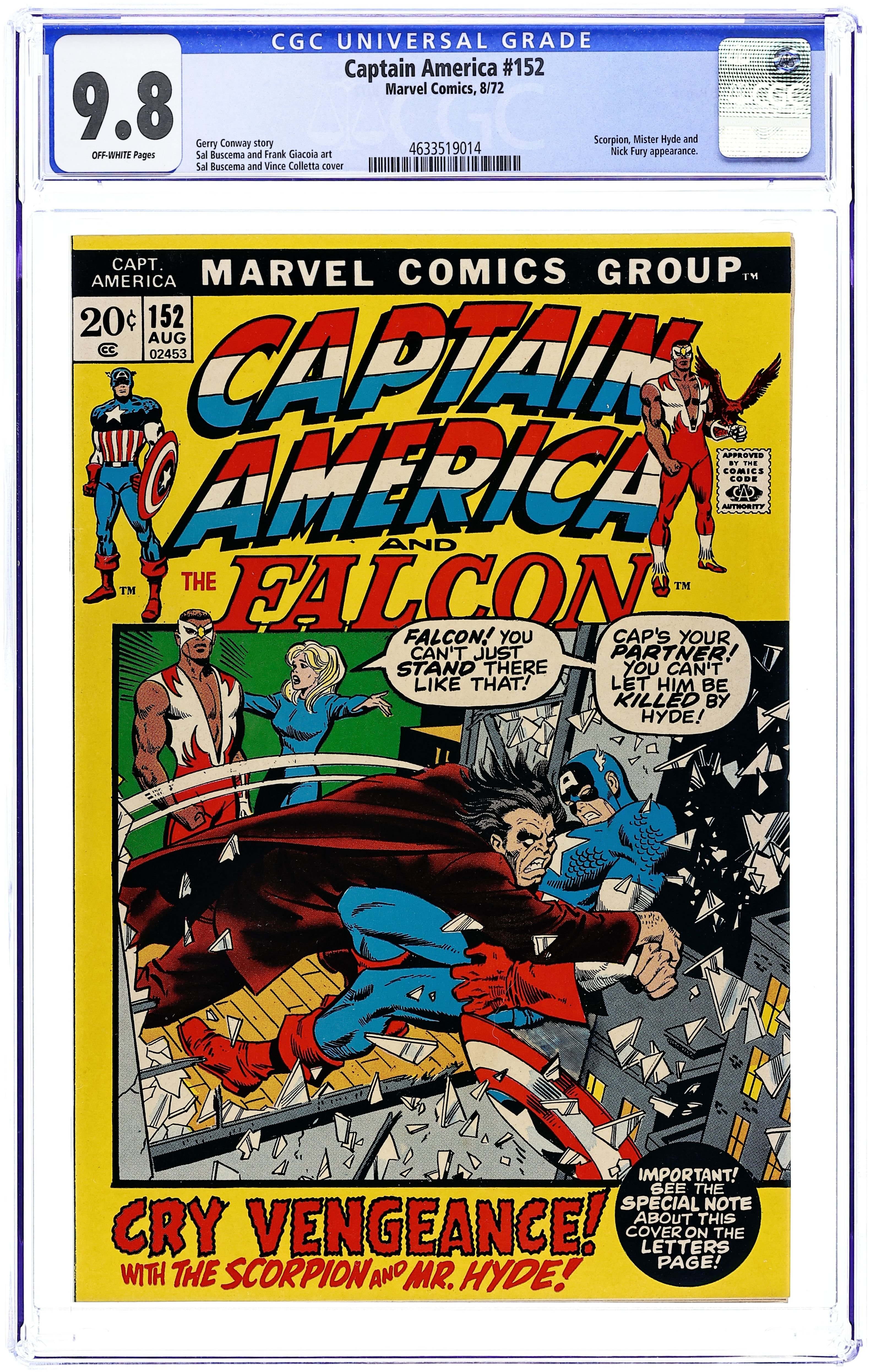 "Terror in the Night!" Part 2 of 2. Script by Gerry Conway. Pencils by Sal Buscema. Inks by Frank Giacoia. Cover by Sal Buscema and Vince Colletta. Mr. Hyde and the Scorpion have abducted Sharon Carter! And a very frustrated Captain America doesn't know where she is! However the Falcon gets a lead on Agent 13's whereabouts from his underworld contacts. And shortly thereafter the Living Legend and his partner rush to an abandoned storage building...where the rescue mission begins! The Falcon frees Sharon, while Cap tackles the Scorpion! But who is going to challenge Mister Hyde? First appearance of the Harlem crime boss known as Morgan. Cameo appearances by Nick Fury, Contessa Valentina Allegra de la Fontaine, Brian Muldoon, and Redwing. (Notes: The cover logo of the Captain America title changes to its most famous version for the next decade. The letters page includes an editorial titled: The Story Behind the Cover. Cap encounters Mr. Hyde again in Captain America 252.) 36 pages. Cover price $0.20. Grade: CGC 9.8 explanation of grade Condition: Used (collectible)