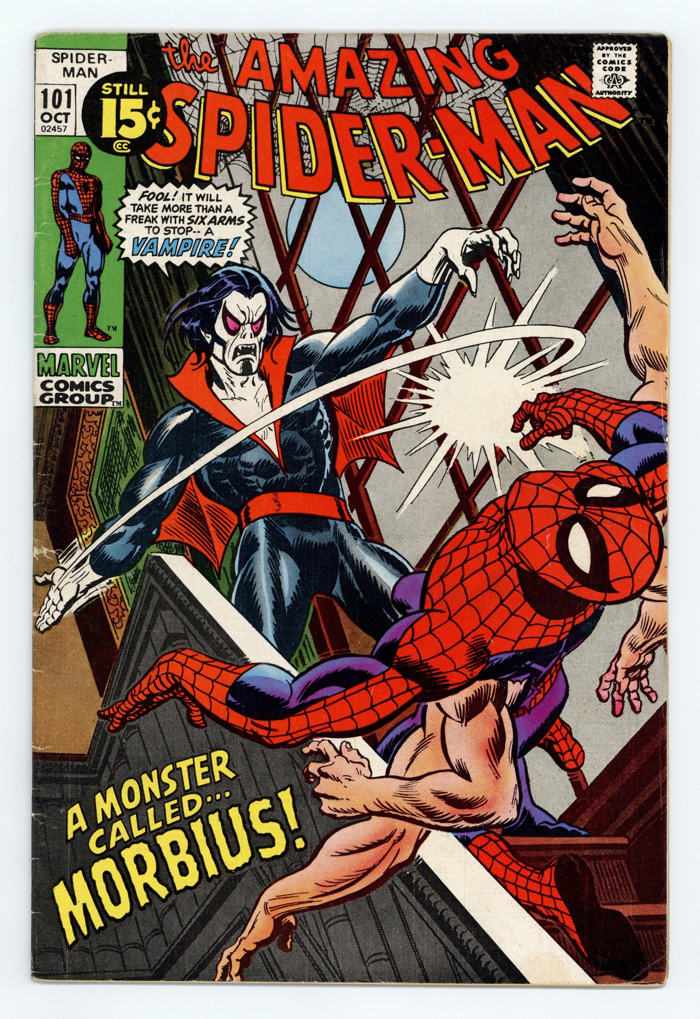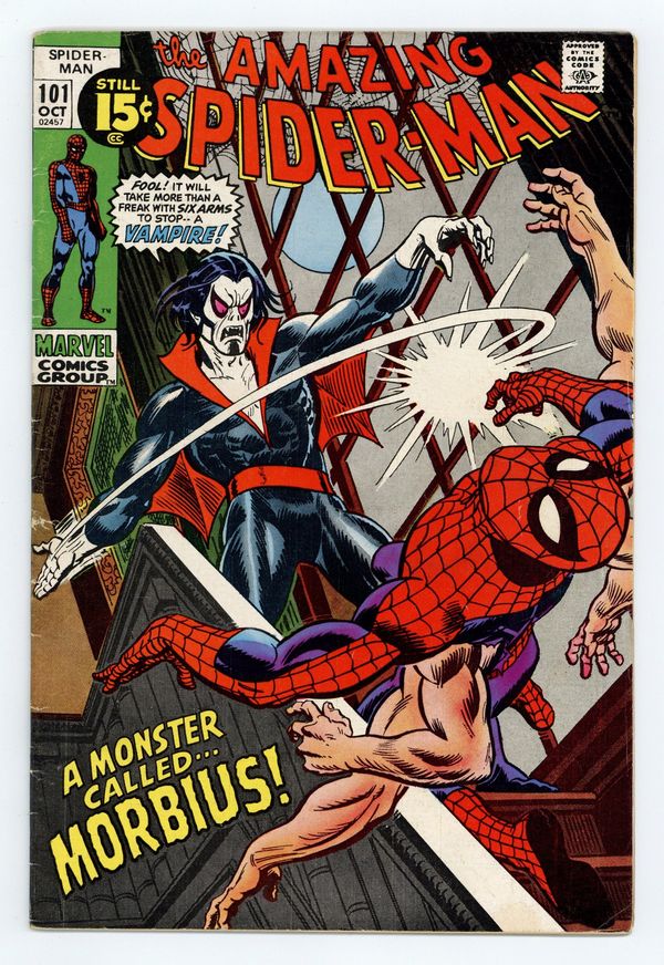 Starts Jul 4 First appearance of Morbius the Living Vampire in "A Monster Called Morbius!" Script by Roy Thomas. Pencils by Gil Kane. Inks by Frank Giacoia. Cover by Gil Kane and John Romita. The first 100 issues of the Amazing Spider-Man title are in the books! And the next chapter in the web-slinger's anthology kicks off with the debut of Marvel's first bronze age vampire: Morbius! However, at the moment Peter Parker has a much bigger problem on his (six) hands. After drinking the special potion he developed, Aunt May's nephew grew four additional arms! Oh, my goodness! Peter is desperate to find a way to remove the arms, so he calls Dr. Curt Connors for help. Dr. Connors has a summer house and laboratory in Southampton on Long Island...and he gives Spider-Man permission to stay there and work on a cure. Meanwhile, a strange, pale, and bloodthirsty man is the sole survivor of a shipwreck near Southampton. And he's looking for a quiet place to rest. Oh no. Is the six-armed Spider-Man on a collision course with a living vampire? Oh yes! Cameo appearances by Gwen Stacy, J. Jonah Jameson, Joe Robertson, and the Lizard. Last 15ยข cover price. (Notes: This is the first issue of the Amazing Spider-Man series not written by Stan Lee. There exists a second printing of this issue published in 1992 with a silver background cover. Marvel also published a facsimile edition of Amazing Spider-Man 101 in 2021.) 36 pages. Cover price $0.15. Grade: VG+ 4.5 explanation of grade Condition: Used (collectible)