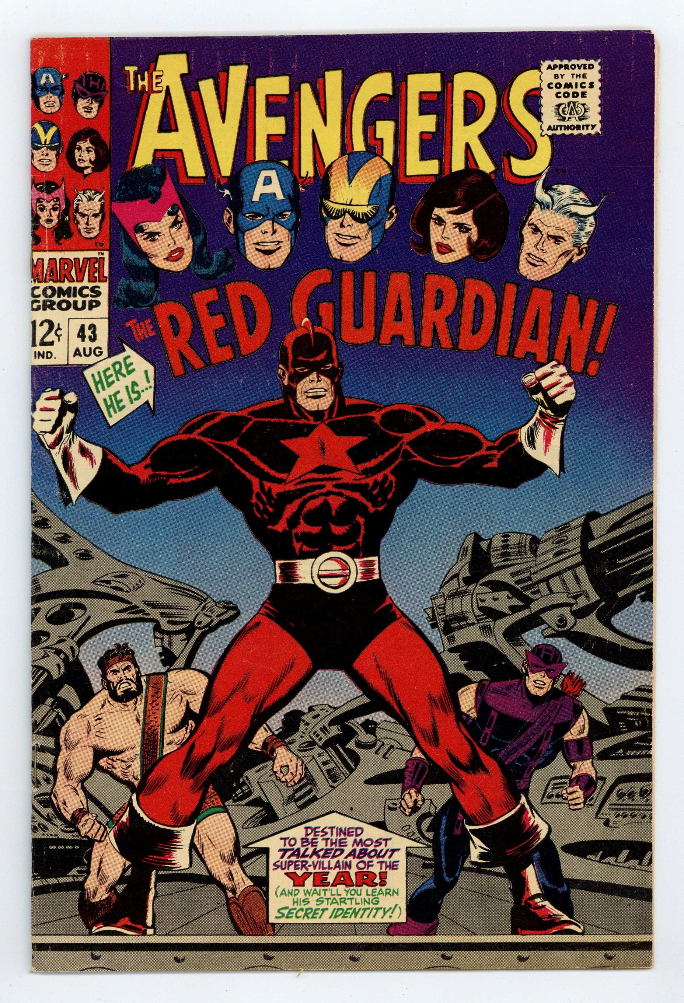 First appearance of the Red Guardian in "Color Him...the Red Guardian!" Part 1 of 2. Script by Roy Thomas. Pencils by John Buscema. Inks by George Roussos (as George Bell). Cover by John Buscema and George Roussos. After receiving a tip concerning the Black Widow's whereabouts, Hawkeye andHercules travel to the Far East to rescue her! But her communist captors have created a super-powered adversary to oppose them: the Red Guardian! Once the Prince of Power and the ace archer arrive in the Middle Kingdom, they defeat the guard force and challenge the Red Guardian! However thecommunist champion is smart and tough! He uses the Psychotron to confuse Hercules -- and next uses his belt weapon to knock out Hawkeye. And then while basking in the glow of his victory, the guardian makes a shocking announcement: Natasha Romanoff is his wife! What a red-letter day for the Red Guardian! Avengers Lineup: Captain America, Goliath, Hawkeye, Hercules, Quicksilver, Scarlet Witch, and the Wasp. (Note: This story was reprinted in Marvel Triple Action #35.) 36 pages. Cover price $0.12. Grade: FN- 5.5 explanation of grade Condition: Used (collectible)