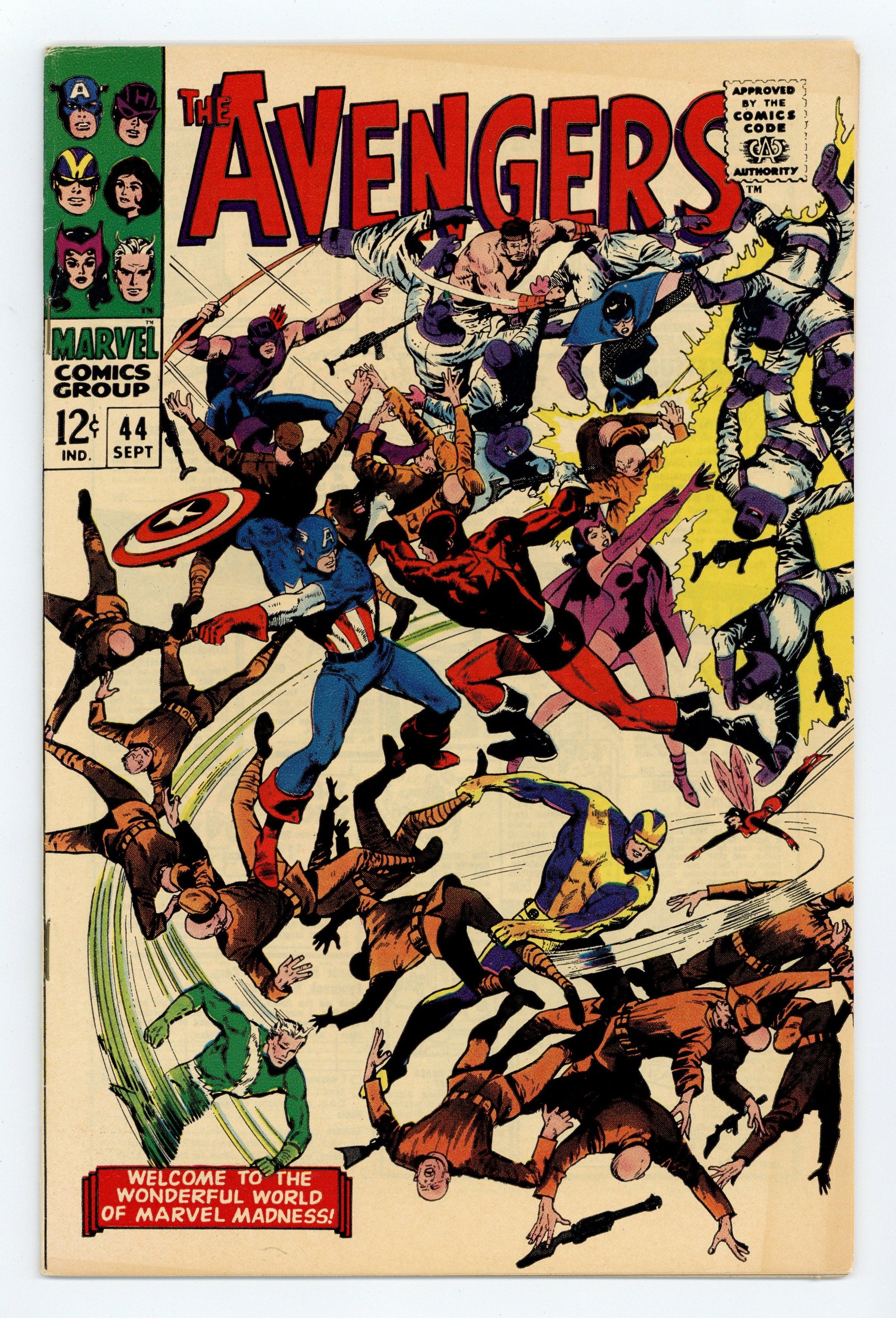 "The Valiant Also Die!" Part 2 of 2. Script by Roy Thomas. Pencils by John Buscema. Inks by Vince Colletta. Cover by John Buscema and Vince Colletta. In the Far East, the Red Guardian and the communists are in control as Hawkeye, Hercules, and the Black Widow are their prisoners! However a minor Sino-Soviet split could eventually prove their undoing. Once Earth's Mightiest Heroes land at the secret military base, the expected free-for-all commences! While Goliath, Wanda, Pietro, and the Wasp fight the enemy soldiers outside the base, the shield-slinger slips inside -- for a cold war showdown for the ages: Captain America vs. the Red Guardian! Wow! But in a twist of fate, the decisive moment of the entire battle occurs when the Black Widow's life is threatened! Will the Red Guardian turn againstthe reds to save Natasha? (Note: This story was reprinted in Marvel Triple Action #36.) 36 pages. Cover price $0.12. Grade: VF- 7.5 explanation of grade Condition: Used (collectible)