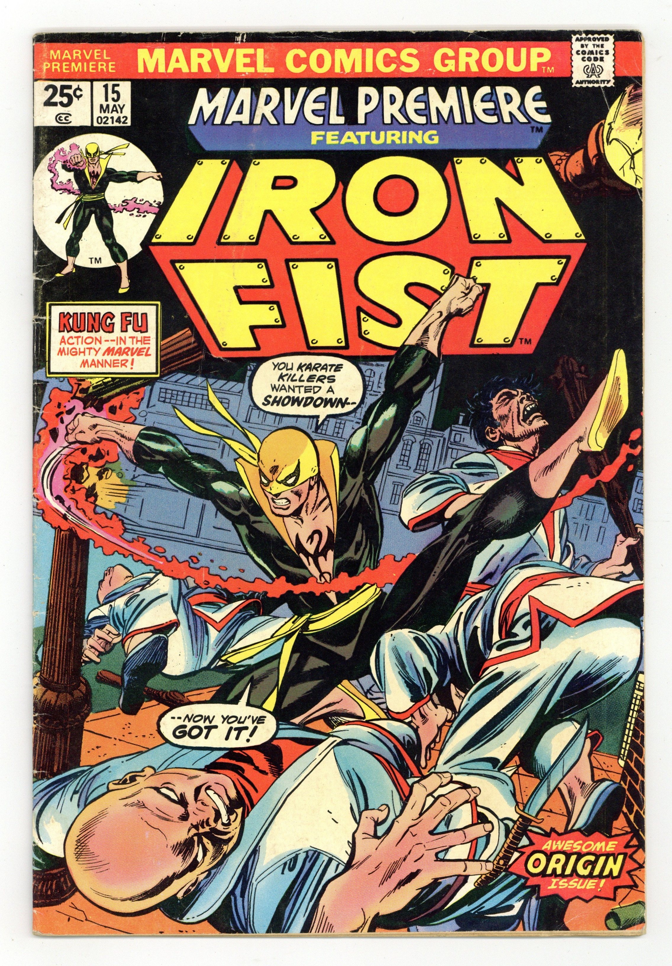 First 25-cent cover price. Origin and first appearance of Iron Fist in The Fury of Iron Fist!, script by Roy Thomas, pencils by Gil Kane, inks by Dick Giordano; Iron Fist passes the final tests in his K'un-Lun training and is granted the privilege of immortality if he so chooses; During his final battle with the robot Shu-Hu, Danny remembers how his father was killed by Meachum and his mother gave her life to save his as the Rand family searched for the fabled city of K'un-Lun. The letters page contains Marvel Value Stamp series A # 94 (Electro by Steve Ditko). Text article explaining price hike to 25 cents for Marvel's 36-page comics, followed by short editorial by Roy Thomas detailing genesis of Iron Fist. 36 pgs. $0.25. Cover price $0.25. Grade: GD/VG 3.0 explanation of grade Condition: Used (collectible)
