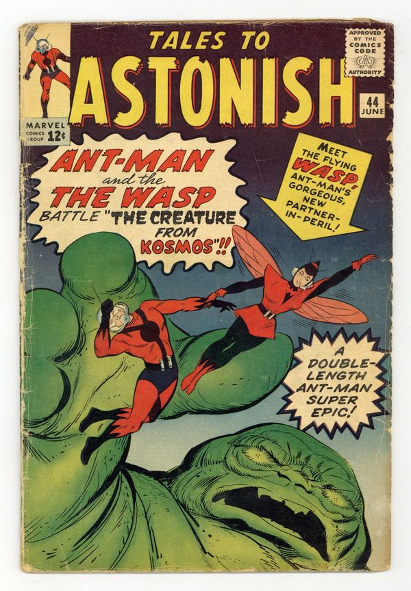 Cover by Jack Kirby and Don Heck. The Creature from Kosmos!, script by Stan Lee and Ernie Hart [H. E. Huntley], art by Jack Kirby and Don Heck; When a fellow scientist is killed by an alien being, Ant-Man enlists the help of the dead man's daughter. Blueprint for Victory text story. Hunted, script by Stan Lee, art by Steve Ditko; In the year 2000 all of New York City is searching for a 'plague carrier' who is attempting to escape notice and flee the city; He is apprehended at a transportation center and the police remove the 'plague' from him which turns out to be a handgun he had stolen from a museum which officials had worried could back bring the plague of war. 36 pgs., full color. $0.12. Cover price $0.12. Grade: GD/VG 3.0 explanation of grade Condition: Used (collectible)