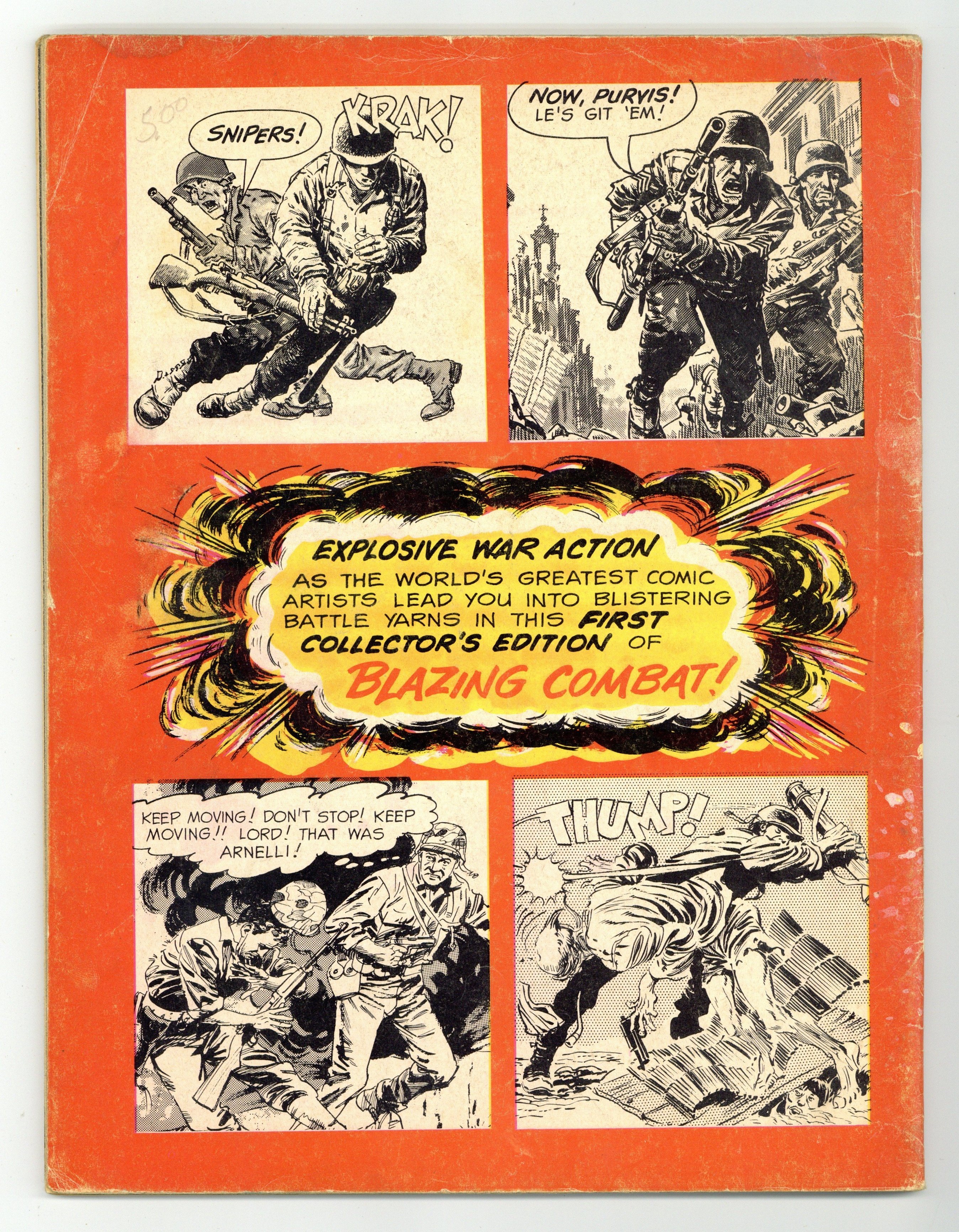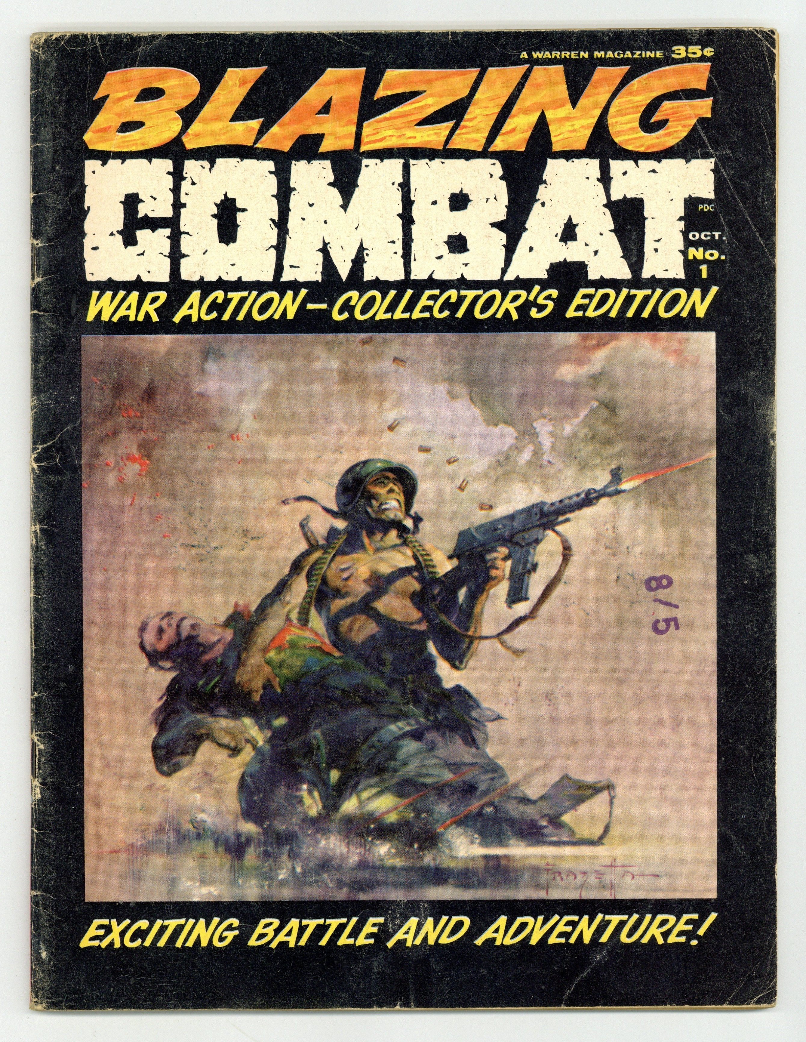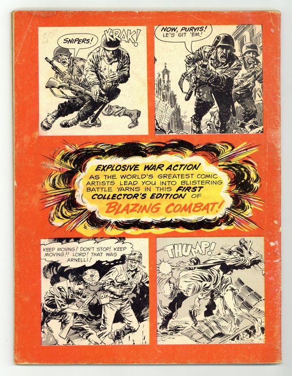 Starts Jul 4 Blazing Combat, which evokes Harvey Kurtzman's Two-Fisted Tales and Frontline Combat, was a short-lived, though critically acclaimed series edited (and mostly written) by Archie Goodwin. The first issue includes the following stories, each of which was written by Archie Goodwin: Viet Cong (art by Joe Orlando); Aftermath! (art by Angelo Torres); Flying Tigers! (art by George Evans); Cong View! (art by Gray Morrow); Cantigny! (art by Reed Crandall); Mad Anthony! (art by Russ Jones, Tex Blaisdell, and Maurice Whitman); and Enemy! (art by John Severin). Cover art by Frank Frazetta. Cover price $0.35. Grade: GD/VG 3.0 explanation of grade Condition: Used (collectible)