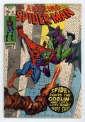 Starts May 11 Not approved by the Comics Code Authority. "In the Grip of the Goblin!" Part 2 of 3. Script by Stan Lee. Pencils by Gil Kane. Inks by Frank Giacoia and John Romita. Cover by John Romita. The fireworks start immediately as the Amazing Spider-Man battles the Green Goblin! And since the web-slinger is always cautious fighting Norman Osborn's alter ego, the goblin wins rounds one -- thanks to his assortment of bizarre weapons! As Peter Parker heads home, he knows the goblin could reveal his secret identity at any moment. But right now Peter has a second problem. His roommate Harry is miffed about Mary Jane...and popping pills left and right! When Peter calls a doctor to get Harry help, someone clad in purple and green shows up first! Oh no, the wall-crawler is caught between a rock and a hard place...with no way out! (Note: This story was reprinted in Marvel Tales #78.) 36 pages. Cover price $0.15. Grade: GD+ 2.5 explanation of grade Condition: Used (collectible)